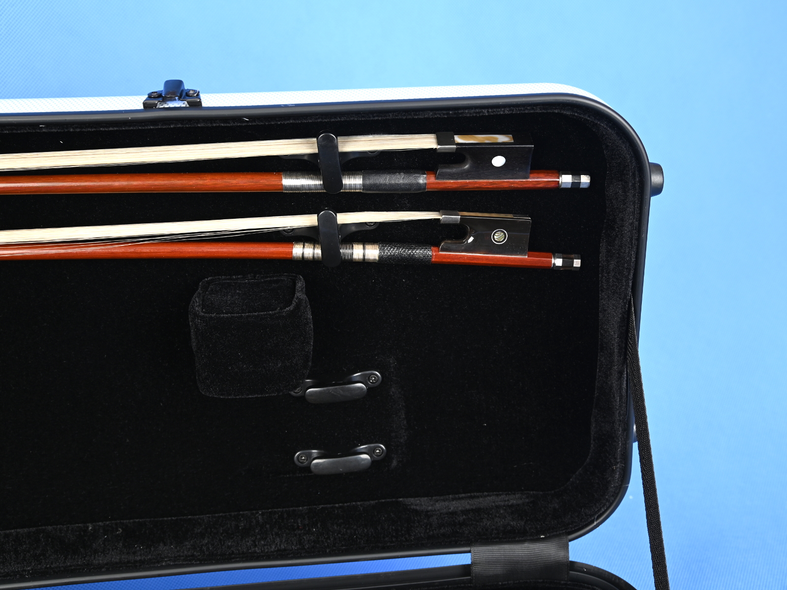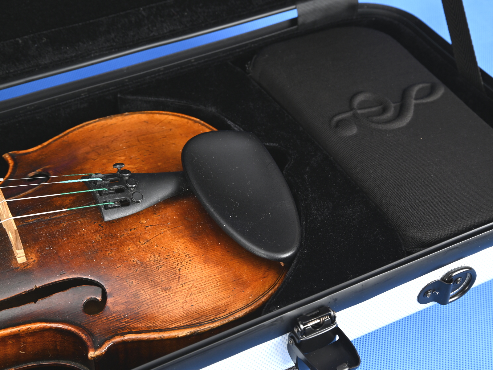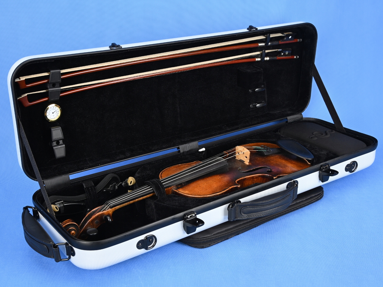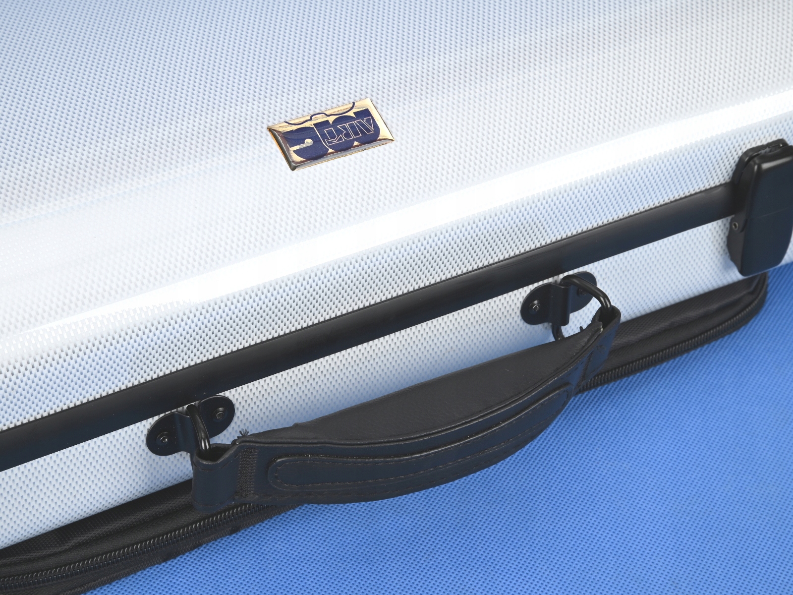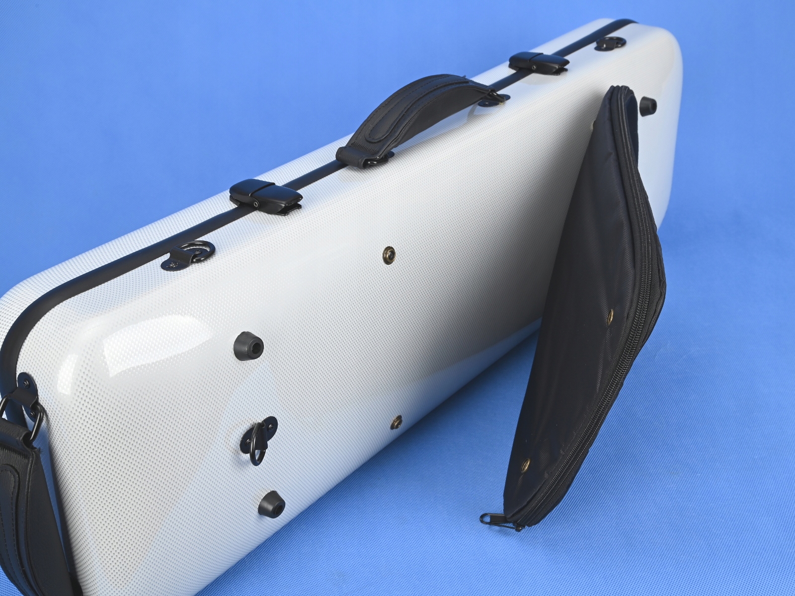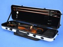 Lekki, prostokątny futerał na skrzypce wykonany z kompozytu poliwęglanu i ABS.