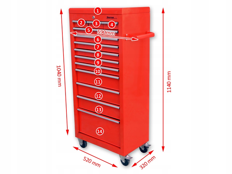 Стальная тележка с тринадцатью выдвижными ящиками на роликовых подшипниках. Имеет два торсионных колеса с дополнительным тормозом.