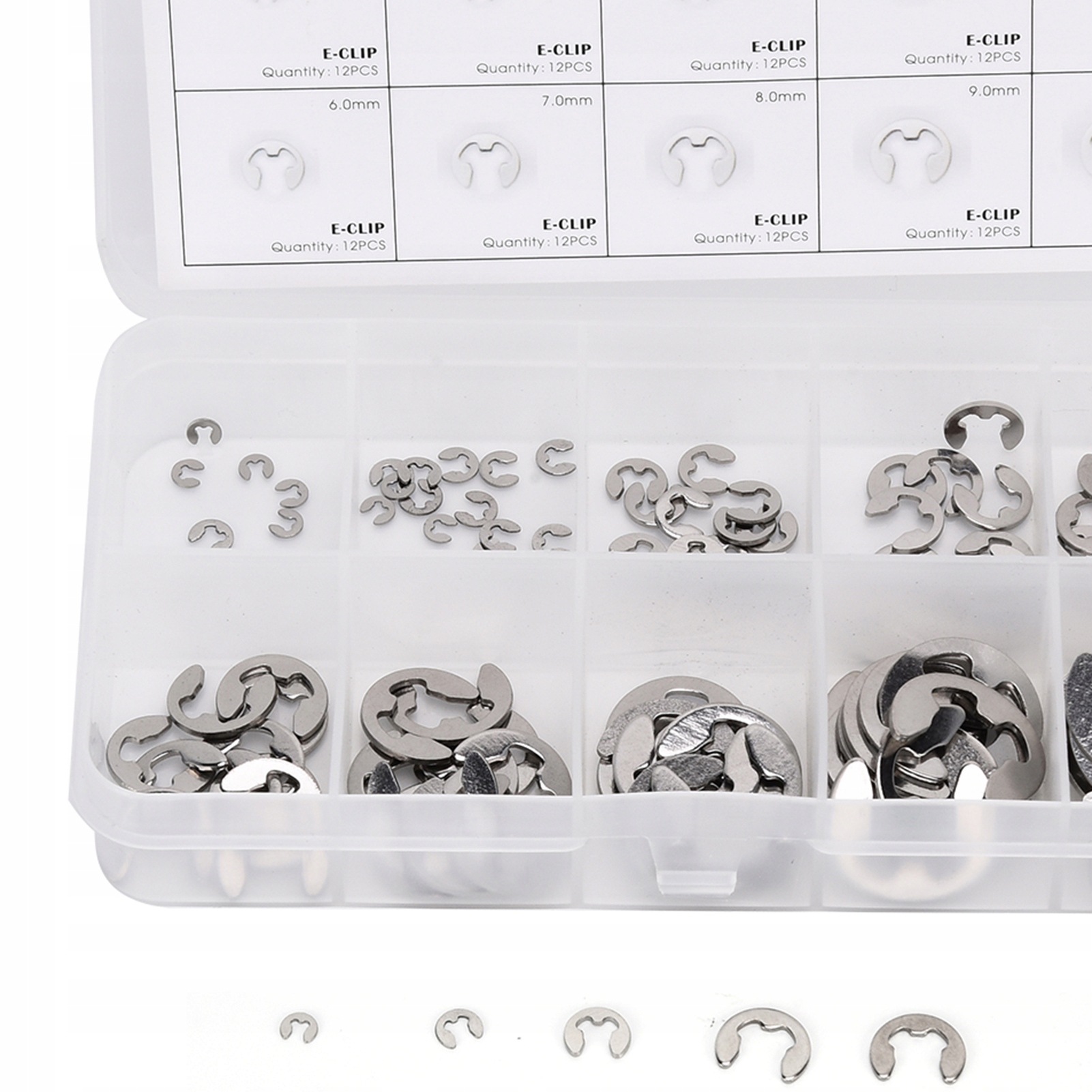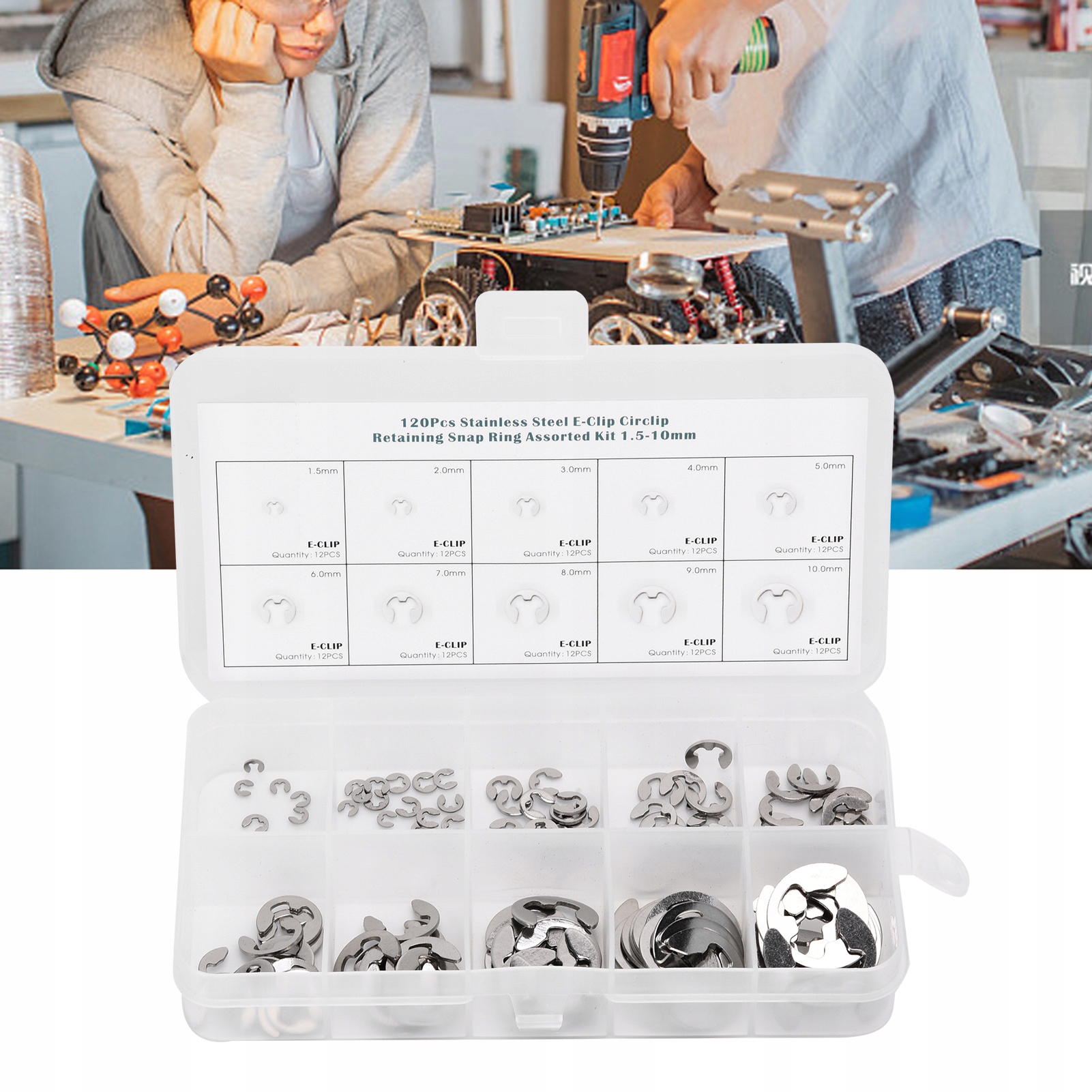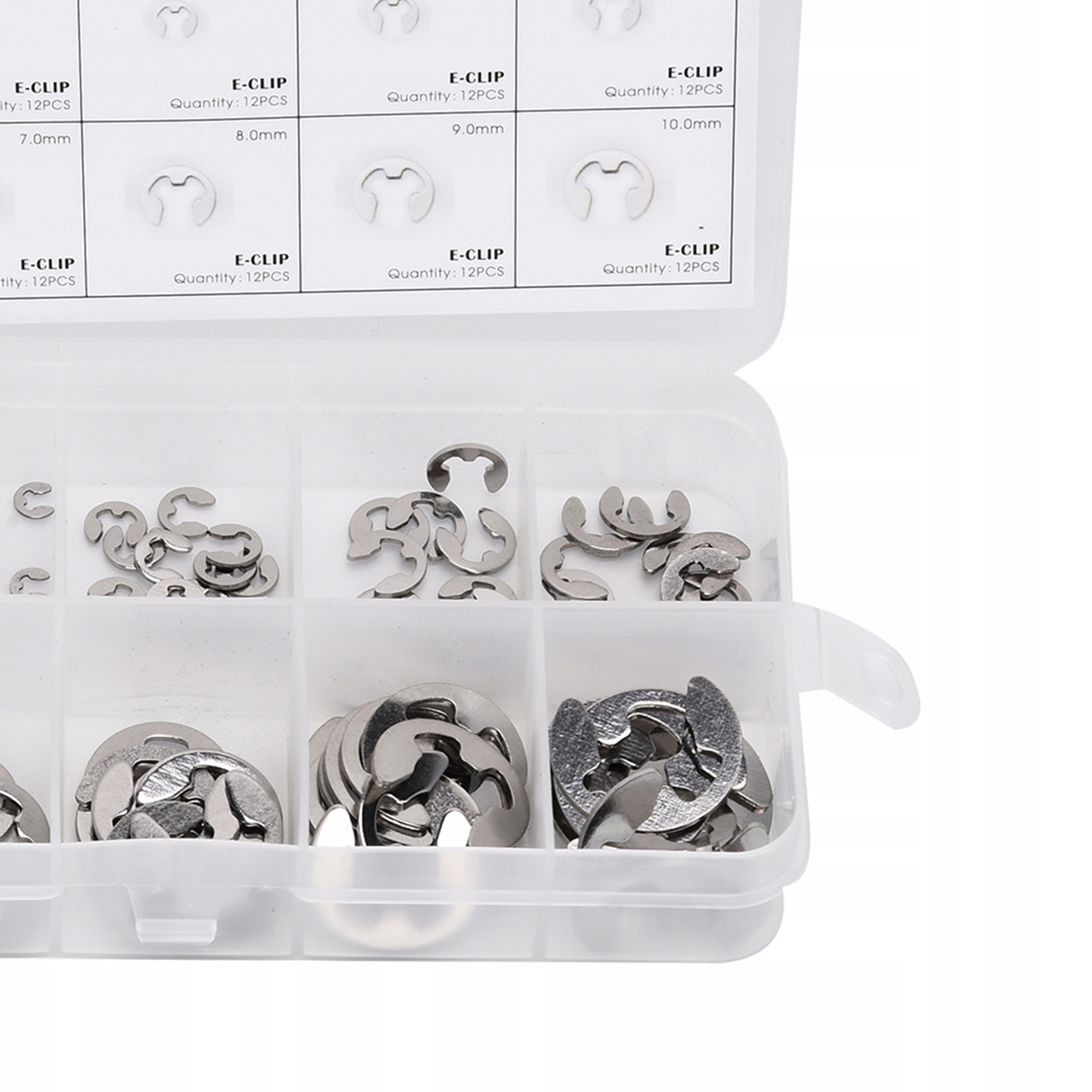 4. Ten zestaw zawiera 120 sztuk pierścieni klipsowych E w różnych rozmiarach, spełniających różne potrzeby robocze w każdych okolicznościach.