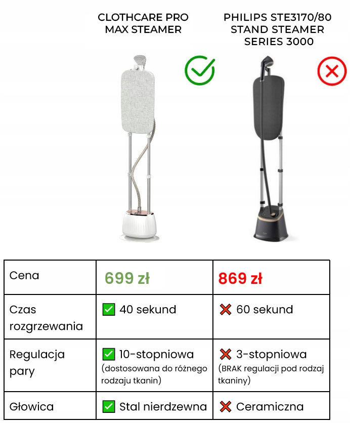 ⭐️ ClothCare PRO Steamer to parownica do ubrań, która oferuje inteligentne dopasowanie temperatury do aż 10 różnych rodzajów tkanin m.in.: