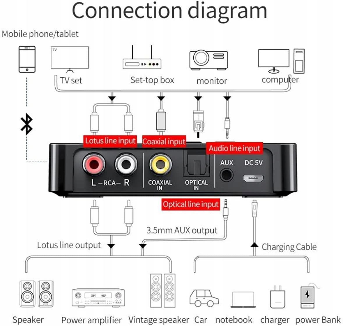 Используется для передачи беспроводной аудиосигнал на наушники или другой приемник bluetooth. Источник звука подключение к адаптеру осуществляется с помощью кабеля aux, S/PDIF или RCA (входит в комплект поставки адаптер aux / RCA).
