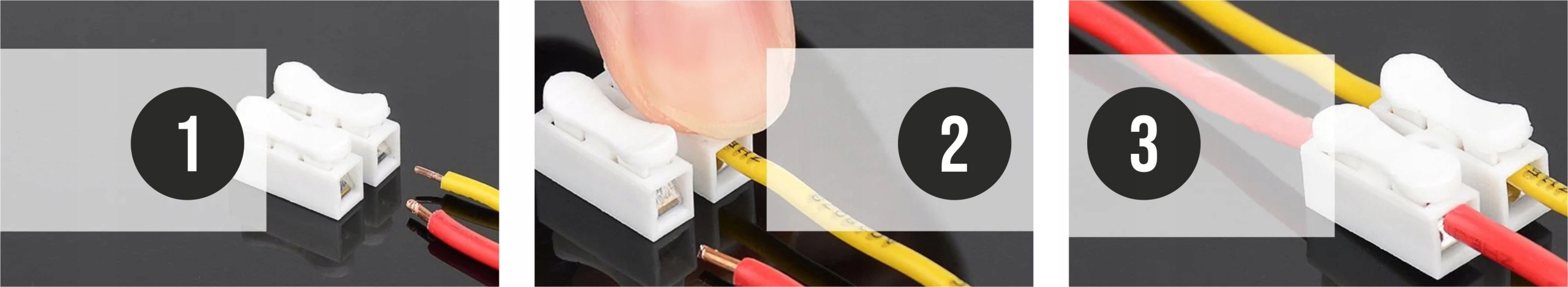 Podłączenie przewodu jest bardzo proste, Nie wymaga użycia żadnych dodatkowych narzędzi. Złączki instalacyjne nadają się do wszystkich rodzajów przewodów.