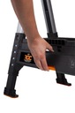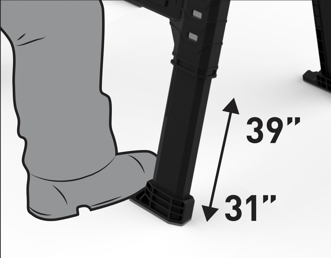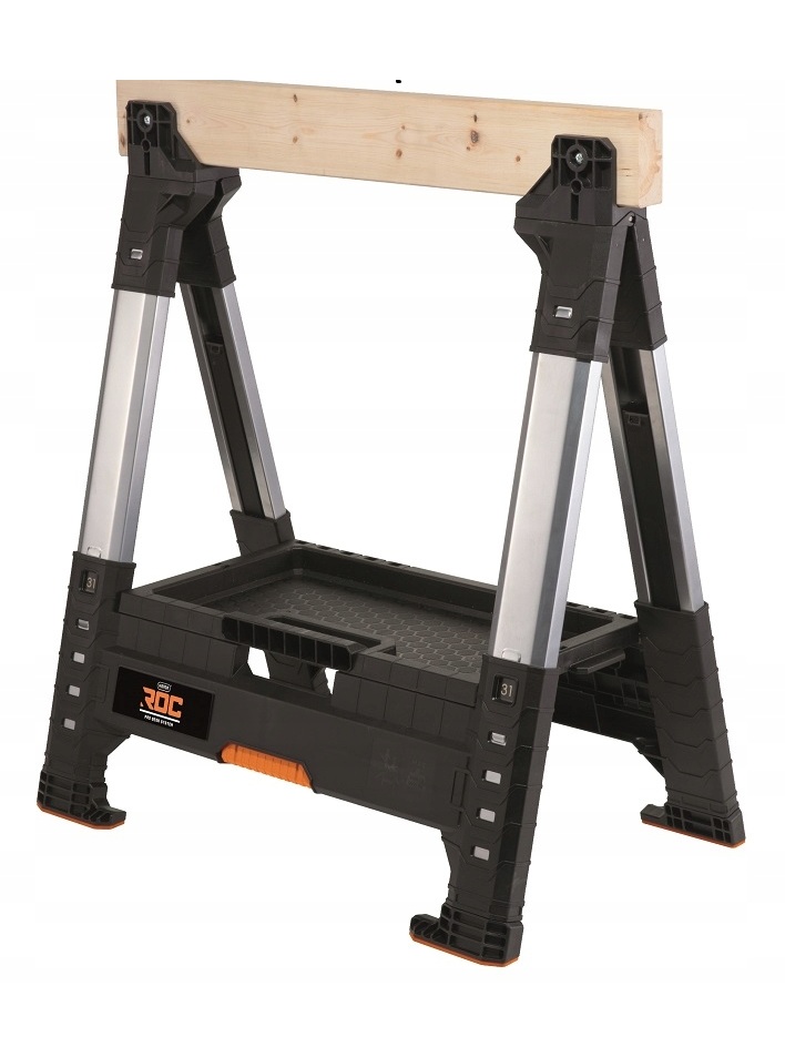 Każda noga stojaka posiada indywidualną regulację, dzięki czemu nadaje się do stosowania na nierównych powierzchniach, poprawiając jednocześnie bezpieczeństwo i komfort podczas prac remontowo-budowlanych. Specjalne zapadki blokujące w systemie regulacji wysokości nóg zapewniają stabilność podczas użytkowania. Nóżki rozciągające się do wewnątrz umożliwiają trzymanie stojaka stopami, regulując długość nóg i zapewniając dodatkową stabilność podczas użytkowania.
