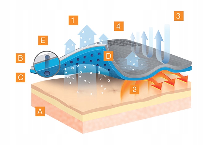 Рафинированная пряжа была создана из микроволокон спандекса и полиамид склеивается с помощью воздушного потока. Ее волокна отличаются уникальной гладкость и высокая износостойкость. Это обеспечивает неизменные размеры и долговечность продукта, несмотря на многолетнее использование и многократную стирку. Пряжа с повышенной эластичностью это позволяет продукту лучше вписаться в тело, что делает перенос влаги еще более более эффективным.