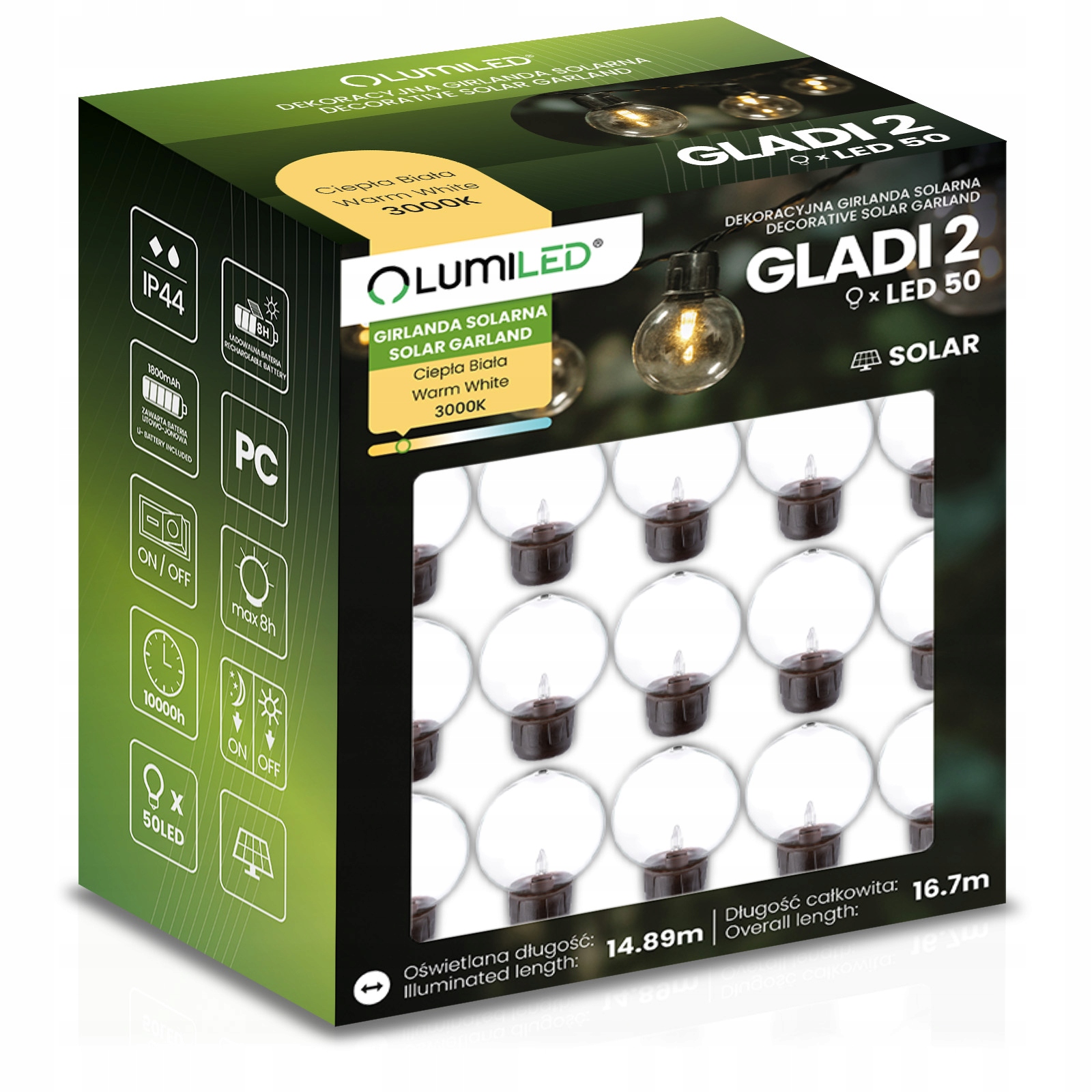 Girlanda solarna Gladi2 marki Lumiled, renomowanego producenta oświetlenia, została zaprojektowana z myślą o tworzeniu nastrojowej i przytulnej atmosfery. Doskonale komponuje się w ogrodzie, a jej elegancki design sprawia, że może pełnić funkcję zarówno dekoracyjną, jak i praktycznego źródła światła, idealnego do altan, tarasów czy przestrzeni rekreacyjnych.