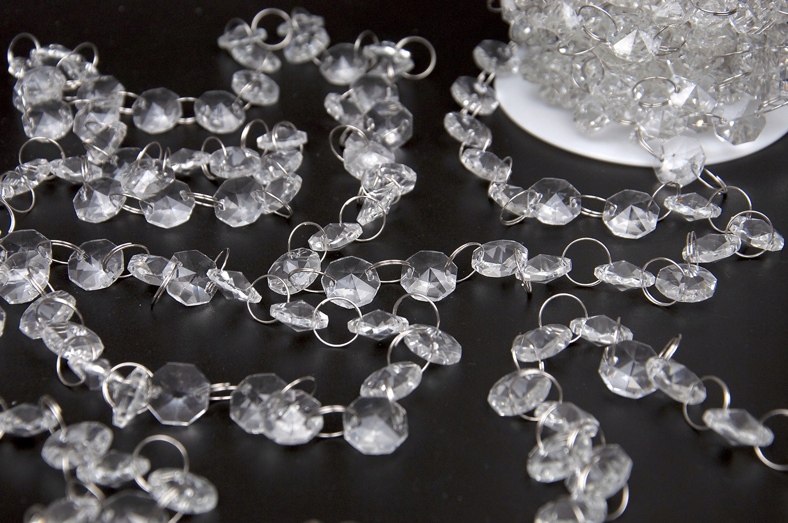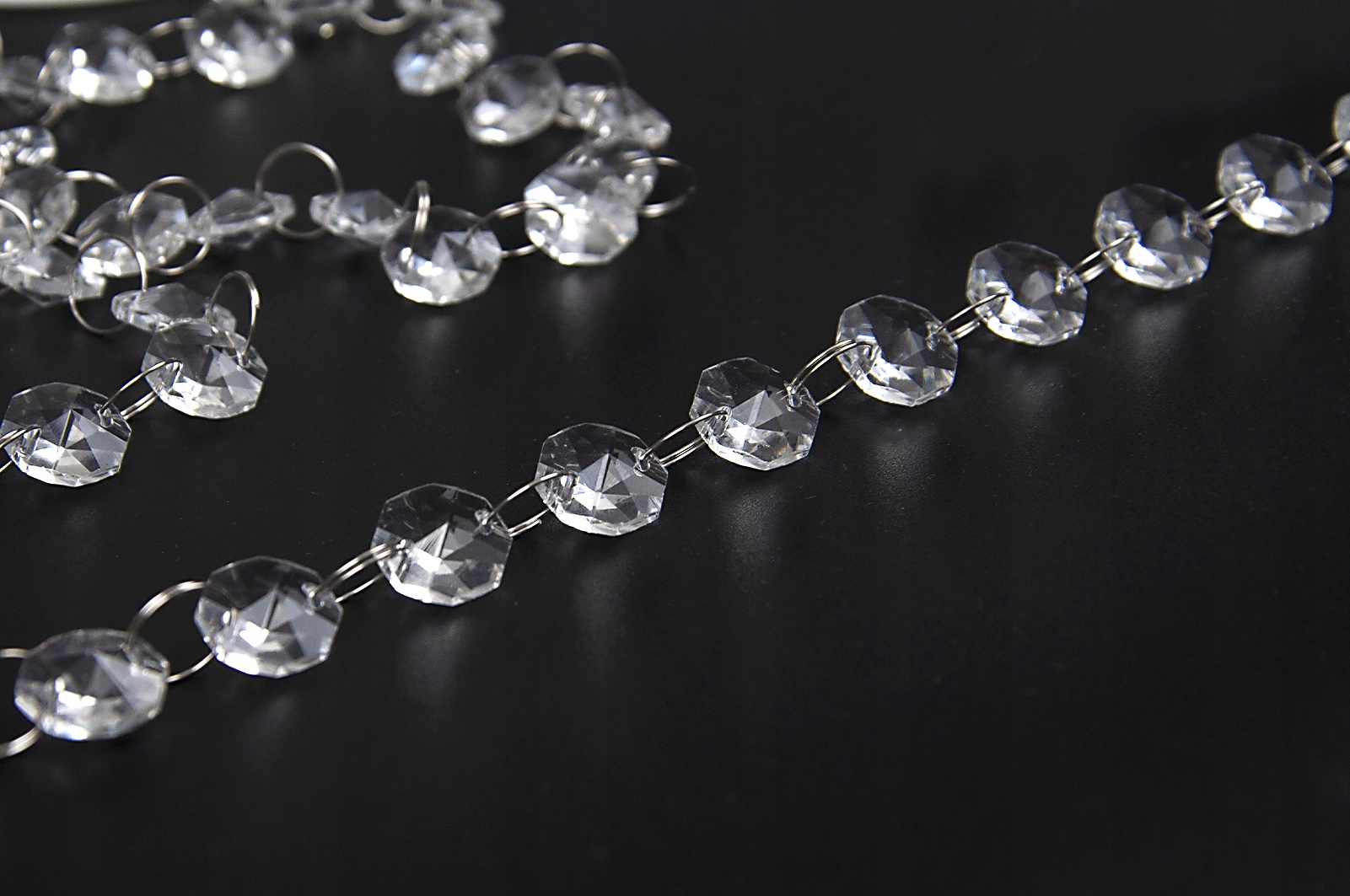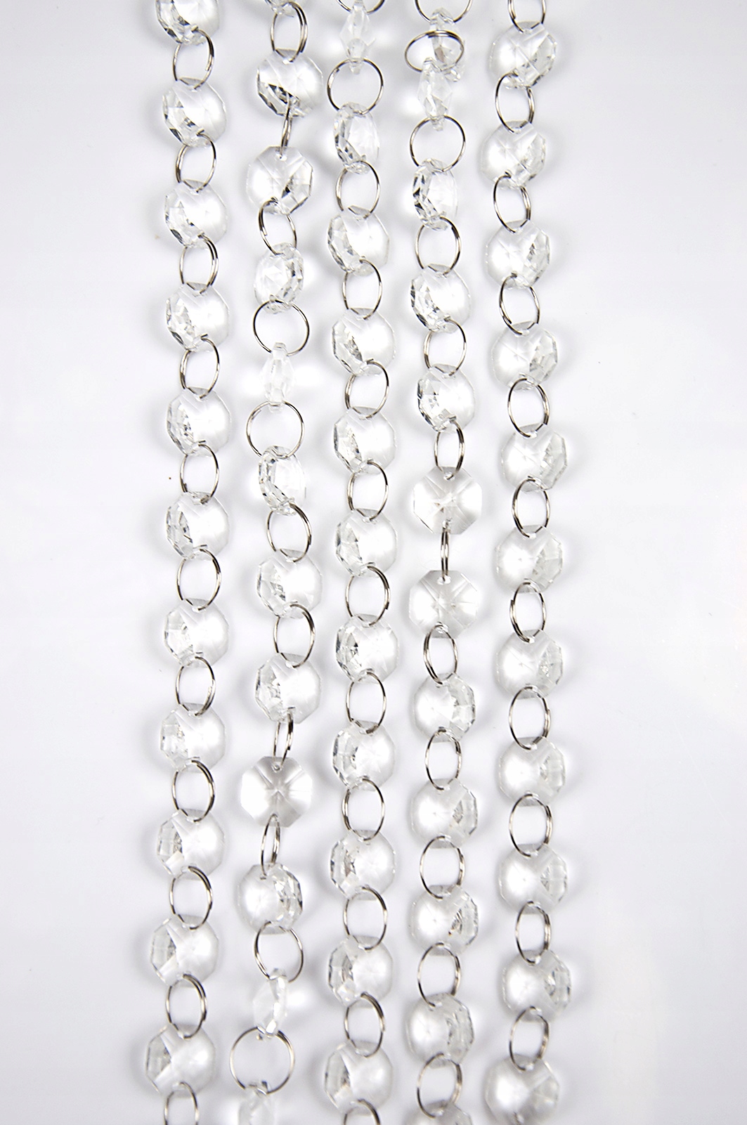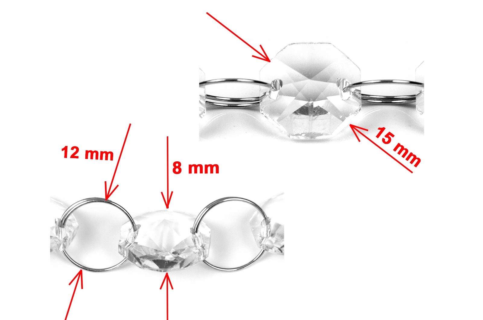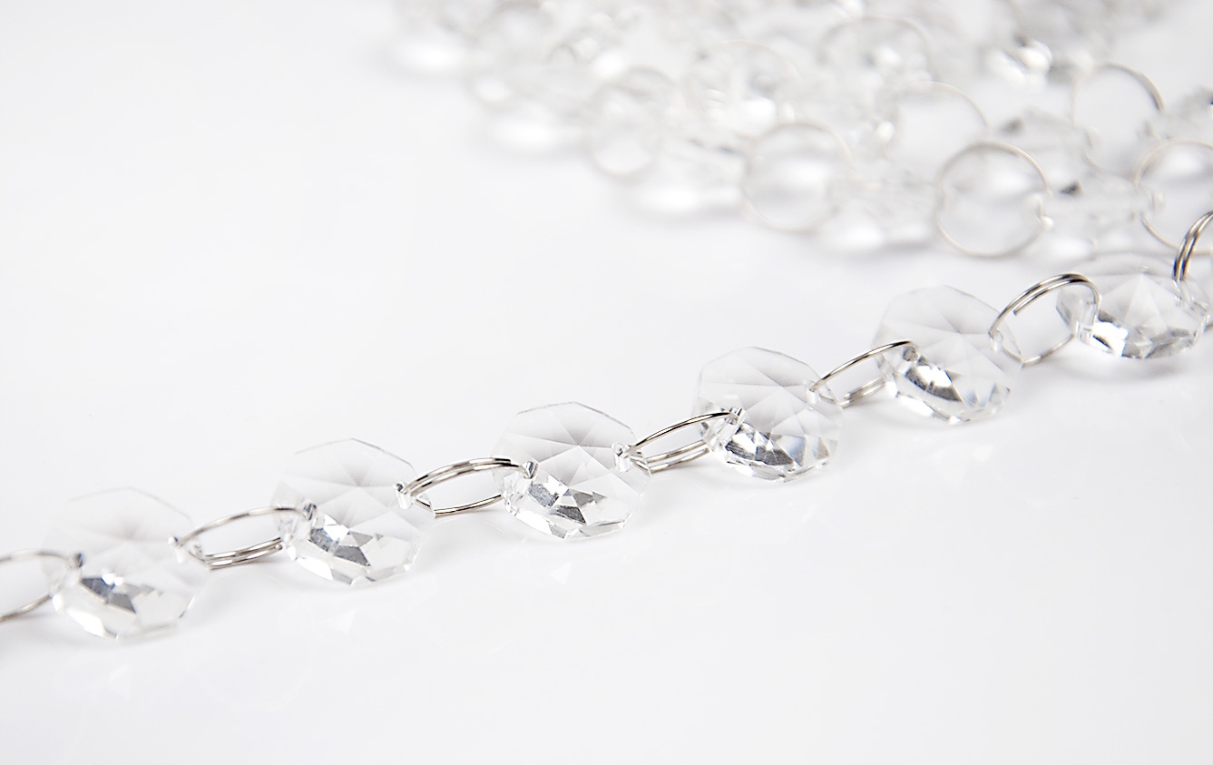 Kryształki cudownie rozpraszają światło, dodając wnętrzu szyku, elegancji i stylu. Pięknie mieniąc się w świetle dziennym jak i sztucznym, rozświetlają każde wnętrze. Połączone są cieniutkimi metalowymi kółeczkami o średnicy 12 mm, ułatwiające podpinanie zawieszek na żabkach, agrafkach i innych elementach służących do podczepiania. Kryształki są bezbarwne, obustronnie lekko stożkowate, w kształcie ośmioboku i mają średnice 15 mm.