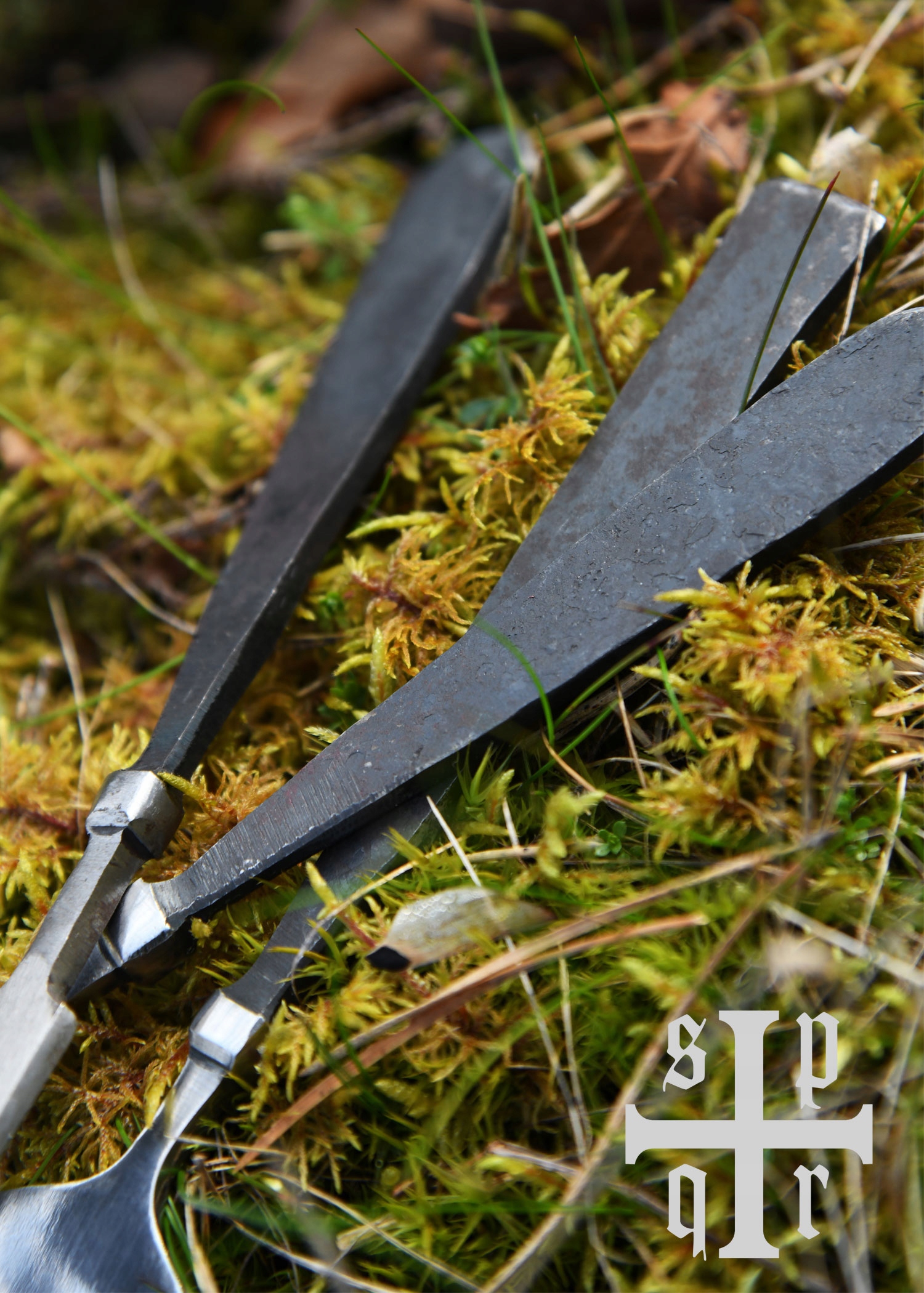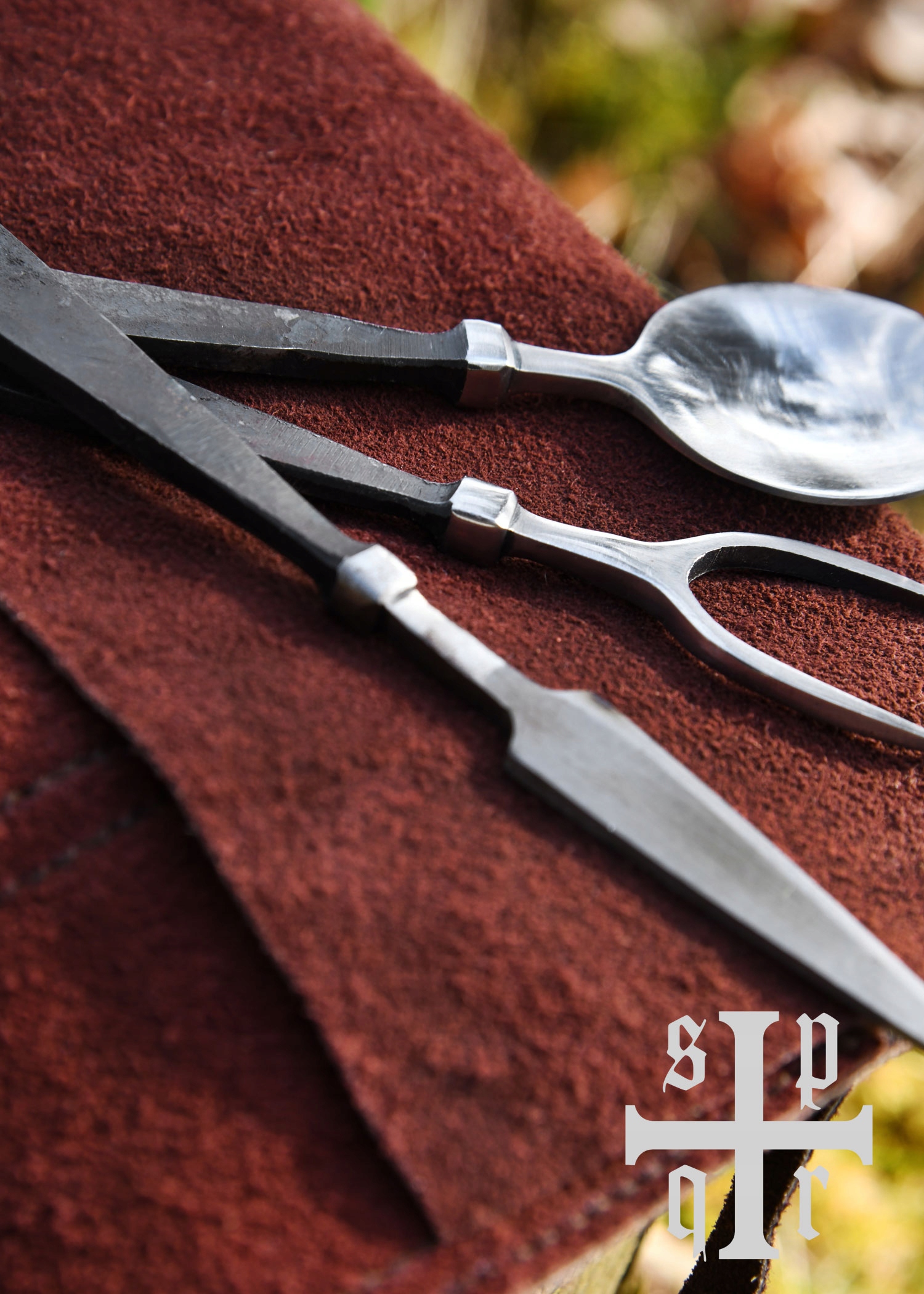 Średniowieczny trzyczęściowy zestaw sztućców, ręcznie kuty, ze skórzanym etui