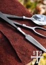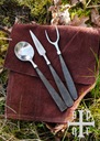 Kształt ostrza noża sprawia, że można go używać również jako szpikulca. Uchwyty sztućców celowo pozostawiono niewypolerowane, ponieważ widoczne na nich ślady kucia nadają im unikalny rustykalny charakter.