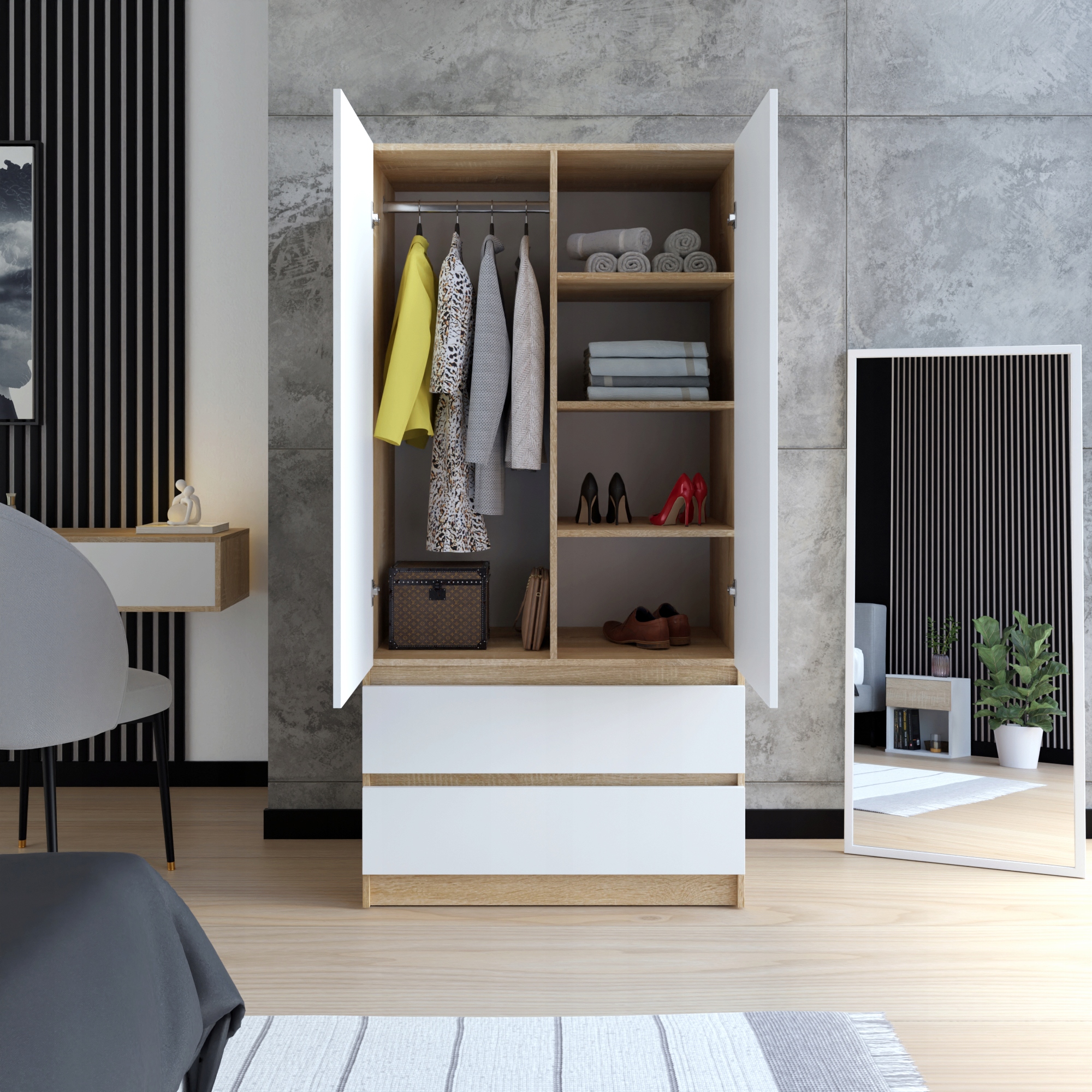 ✨Nowy model szafy w sonomie z białym matem, która doskonale łączy w sobie nowoczesny design z klasyczną elegancją. Jest kompaktowa i praktyczna.