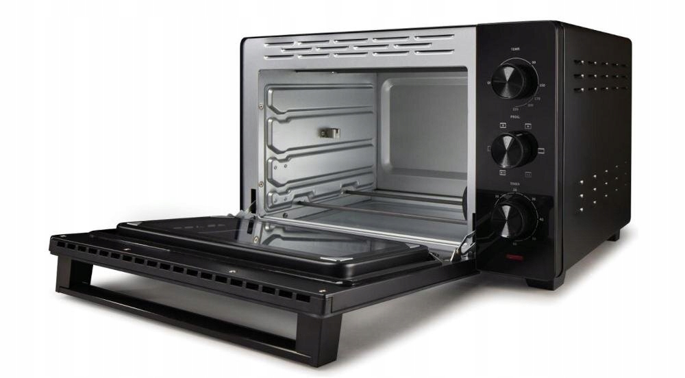 Ten mały piekarnik może z łatwością zastąpić pełnowymiarowy piekarnik w Twojej kuchni. Możesz całkowicie dostosować jego zastosowanie do swoich potrzeb, wybierając spośród pięciu różnych kombinacji trybów grzania (grzanie górne i dolne w połączeniu z konwekcją lub rożnem), ustawiając temperaturę w zakresie 90°C - 220°C i czas do 60 min.