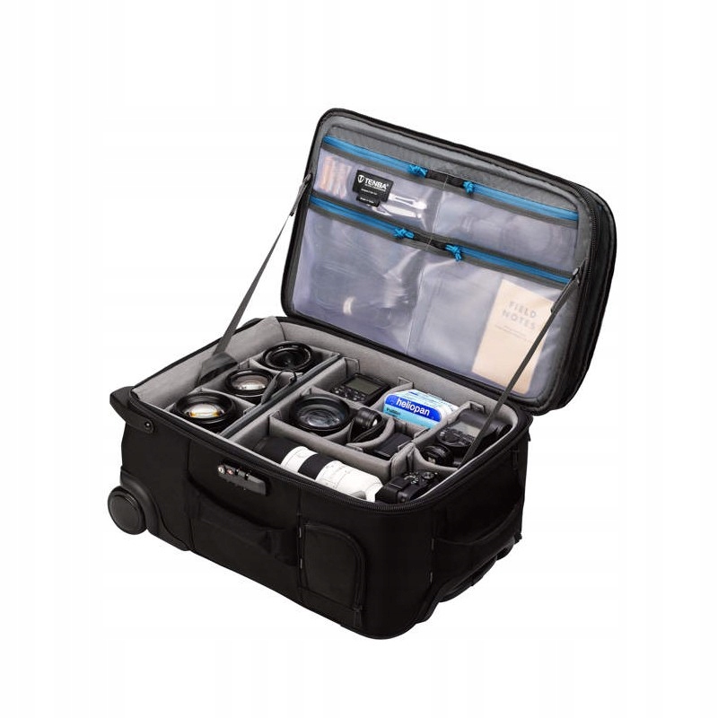 Roadie Roller 21 Tenba Roadie Roller jest propozycją dla profesjonalnych fotografów i filmowców oczekujących eleganckiej dyskrecji i ochrony sprzętu na najwyższym poziomie. Wykonana z wyjątkowo trwałych materiałów oferuje wysoki standard bezpieczeństwa przenoszonego sprzętu. Seria Roadie składa się z 5 modeli walizek i dwóch rodzajów plecaków.Roadie Roller to walizka w której aspekt bezpieczeństwa został potraktowany priorytetowo. Walizka posiada wbudowaną, szyfrowaną blokadę która jest zintegrowana z głównym zamkiem. Dodatkowo posiada stalowy, pleciony kabel przy pomocy którego możemy przymocować walizkę do nieruchomego elementu. Zewnętrzny materiał to solidny nylon posiadający zwiększoną odporność na złe warunki atmosferyczne. Dzięki nowoczesnemu wzornictwu nie zwraca na siebie uwagi a solidna budowa i odpowiednie materiały zadbają o najwyższą ochronę cennej zawartości walizki. Specyfikacja: Waga: 4,8 kg Wymiary zewnętrzne: 36 x 53 x 23 cm Wymiary wewnętrzne: 30 x 43 x 15,8-19,