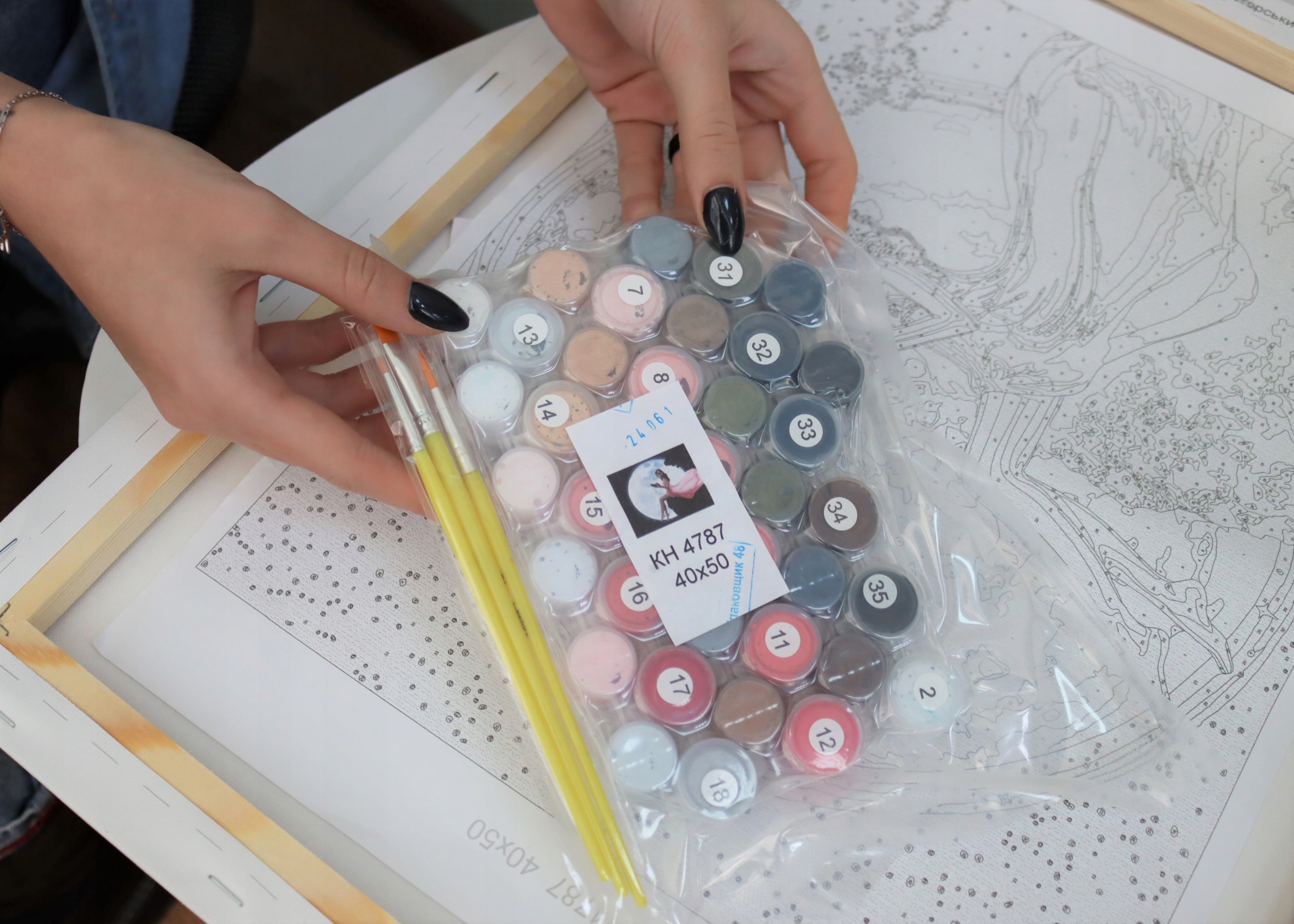 Состав: пронумерованный натуральный холст на холсте, нейлоновые художественные кисти, набор пронумерованных акриловых красок в контейнерах, контрольный лист (бумажный или с QR-кодом).