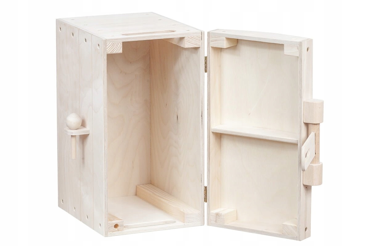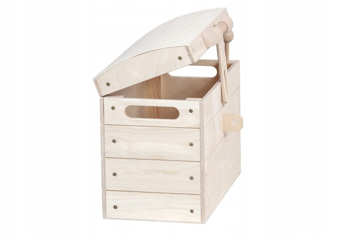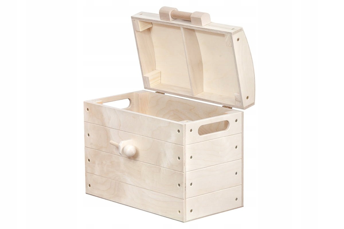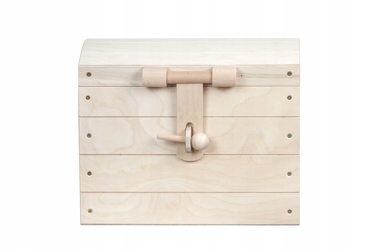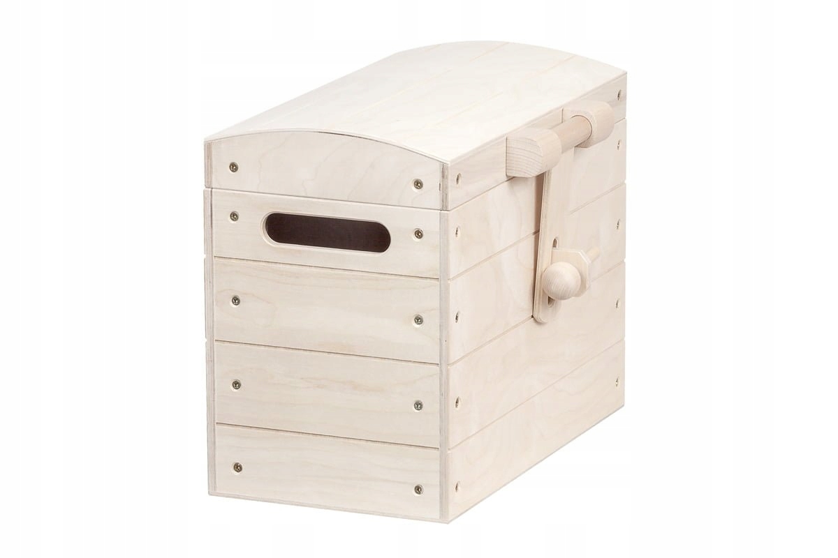 Ozdobna skrzynia dokładnie i estetycznie wykonana z drewnianej sklejki. Zamykana oryginalnym, drewnianym skoblem. W bocznych ściankach wyfrezowane uchwyty ułatwiające przenoszenie.