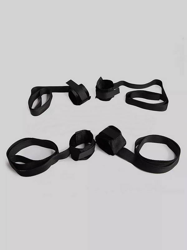 Komplet kajdanek na ręce oraz nogi, zapinane na rzepy. Długie sznurki do przywiązywania.