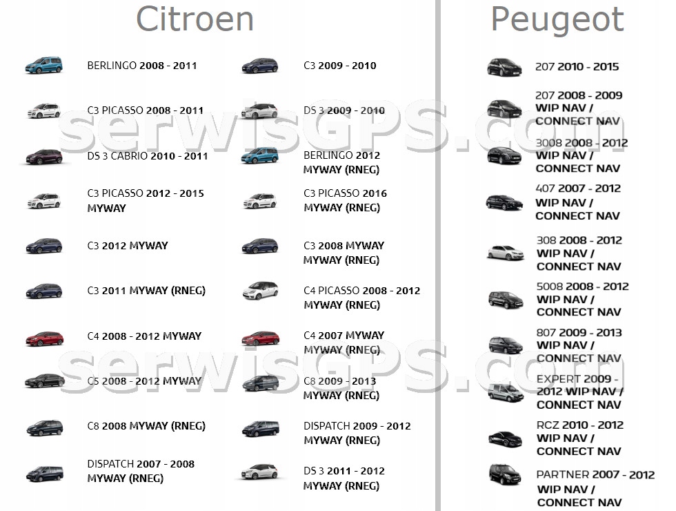 Peugeot (wszystkie modele z RNEG MyWay) : 207 , 2008 , 307 , 308 , 308 SW , 3008 , 407 , 4007 , 508 , 5008 , 607 , 807 , Expert , Partner