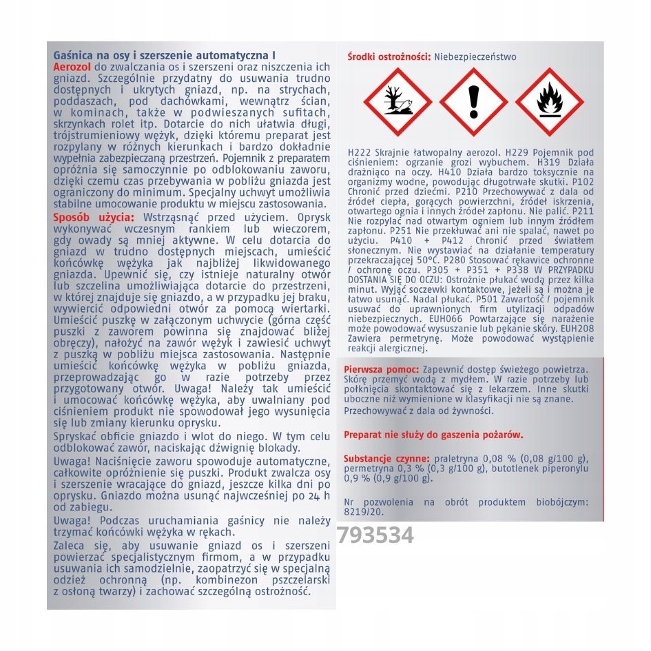 Aerozol do zwalczania os i szerszeni oraz niszczenia ich gniazd.