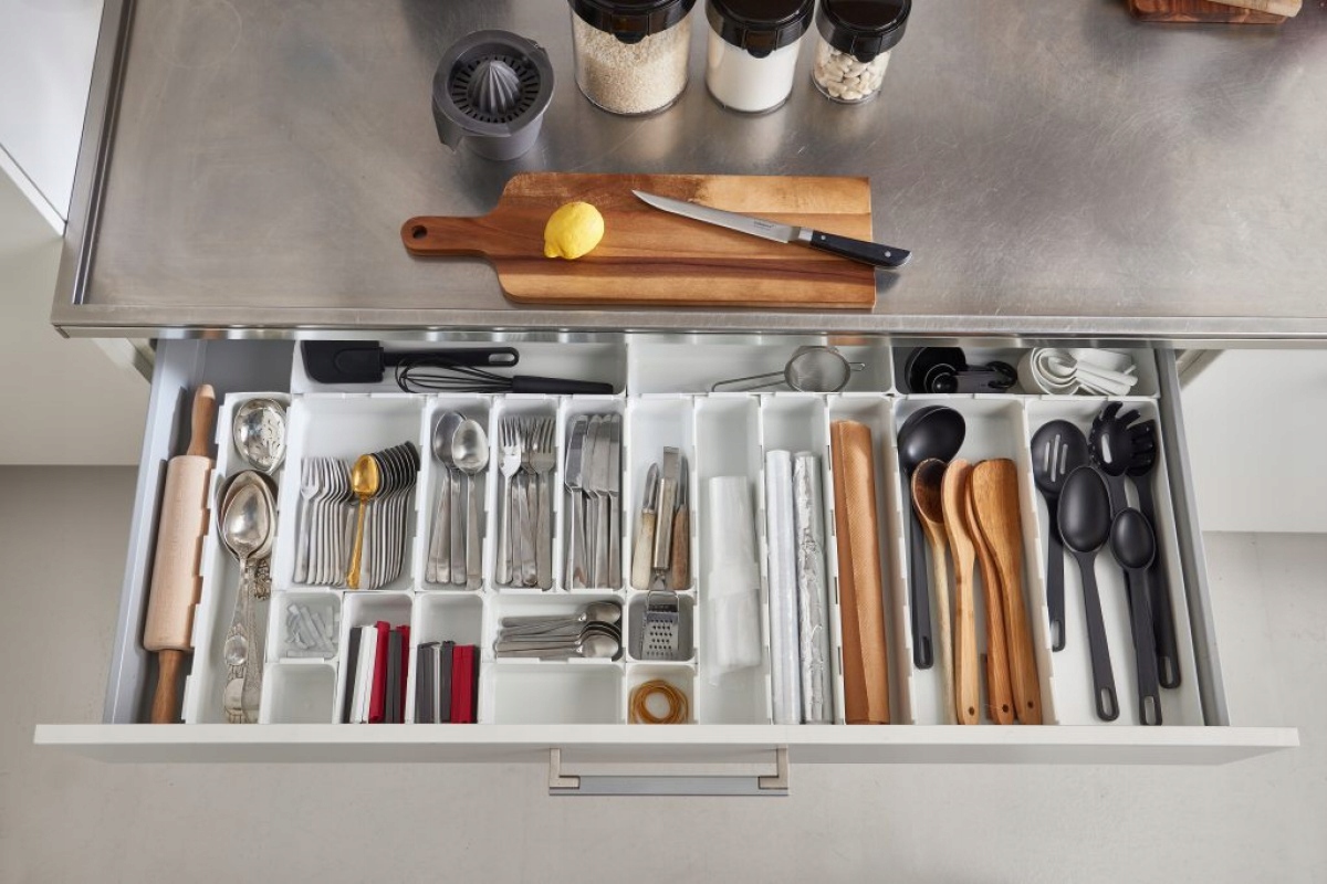 Zestaw modułów do szuflad umożliwia tworzenie własnego systemu przechowywania akcesoriów kuchennych.