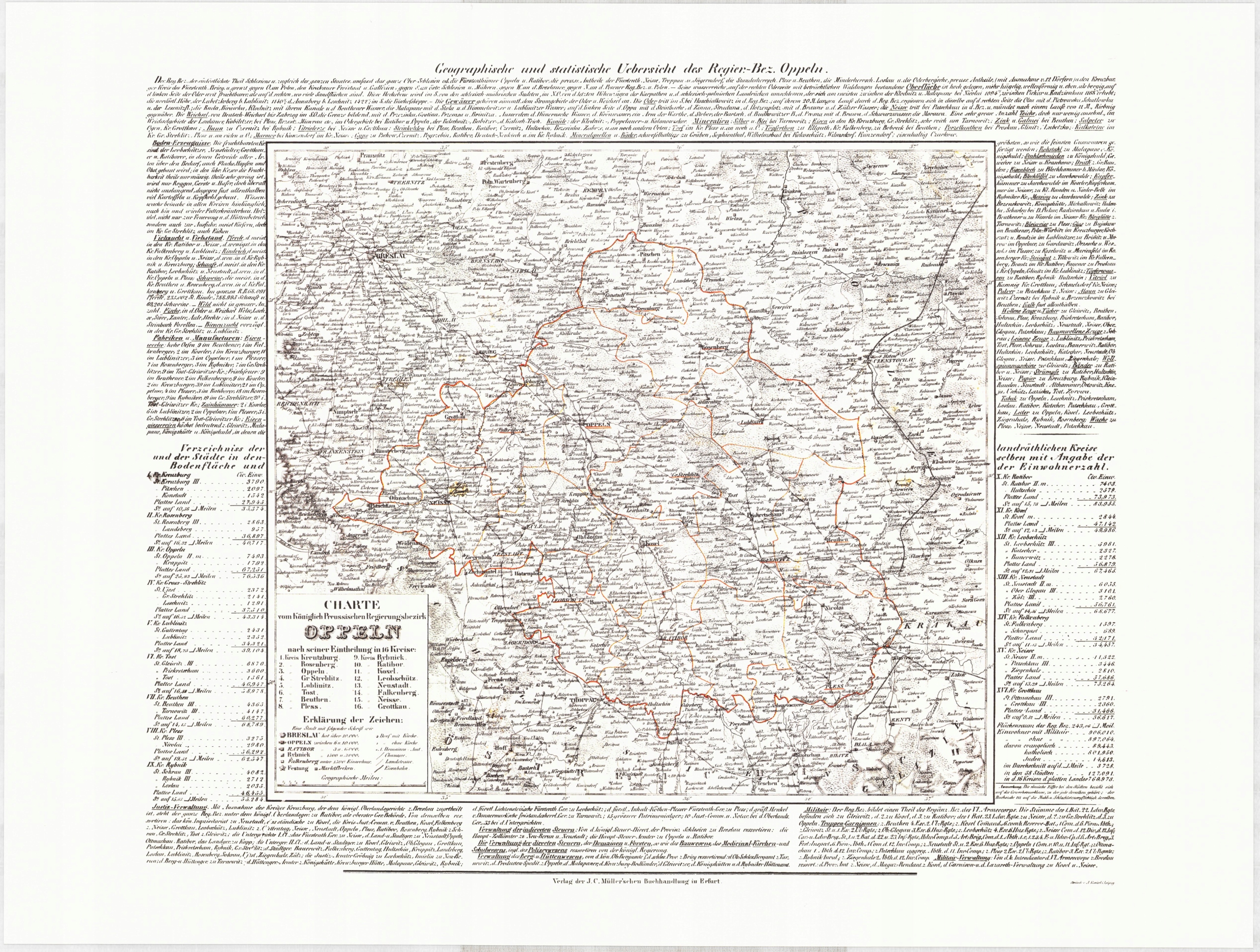 Mapa administracyjno - statystyczna Rejencji Opolskiej, z zamieszczonymi obszernymi opisami statystycznymi dotyczącymi powierzchni, liczby ludności oraz rodzajów działalności gospodarczej. Wyd.: J.G. Muller'schen Buchhandlung in Grfurt. Podziałka liniowa: 5 mil geograficznych = 7,5 cm. wym. 37 cm x 33,5 cm, druk, jbw, papier czerpany. Archiwum Państwowe w Katowicach, Odział w Gliwicach, sygn. Zbiór kartograficzny 357.