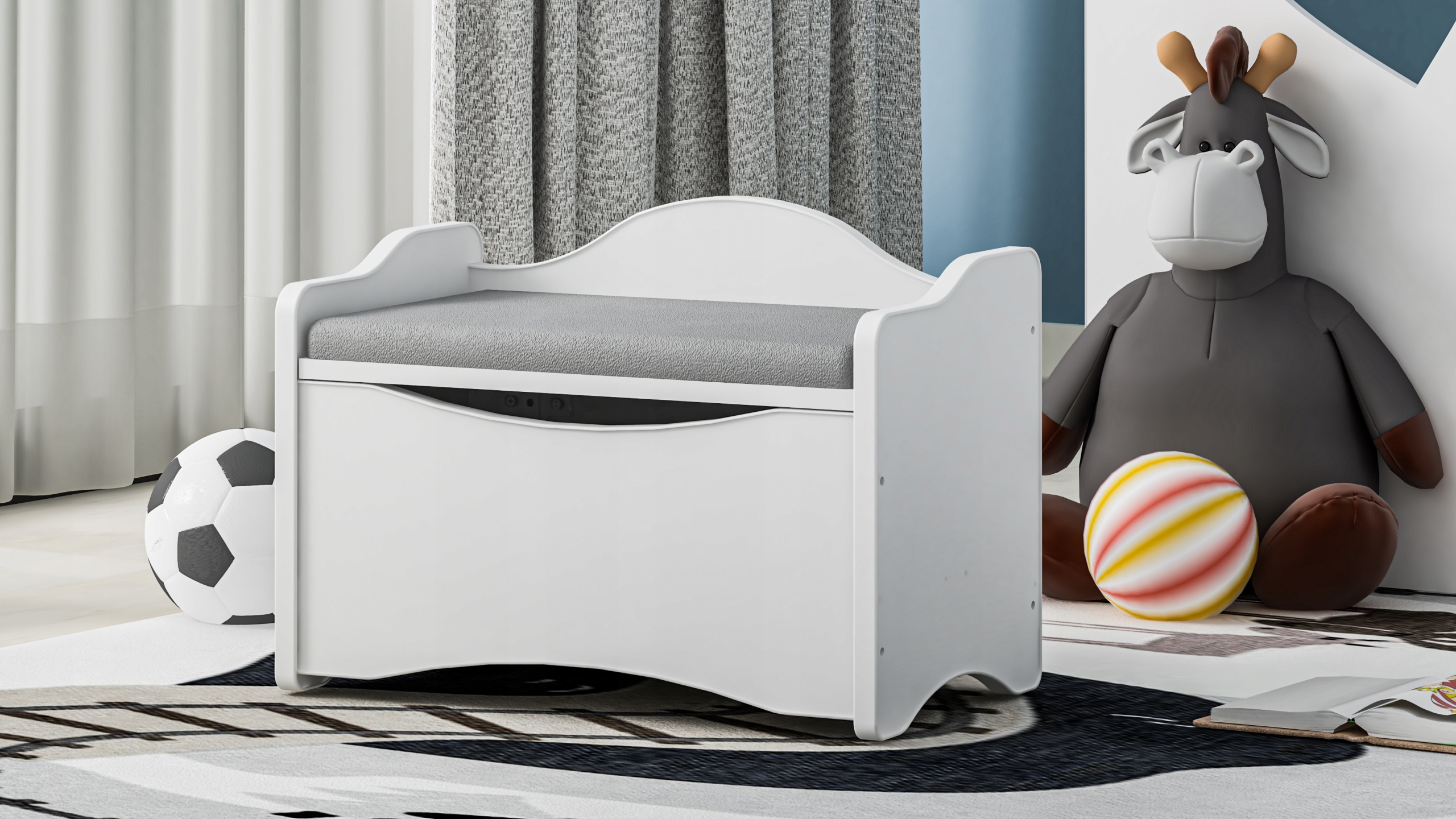 Kuferek został również wyposażony w wygodne siedzisko piankowe, które umożliwia dziecku odpoczynek podczas zabawy lub wygodne miejsce do siedzenia podczas czytania ulubionej książeczki.