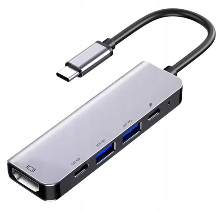 Wysokiej jakości designerski multi-port 5w1 adapter dla Twojego urządzenia. Wysokiej jakości - obudowa wykonana z aluminium w kolorze gray. Hub usb wyposażony w szereg niezbędnych portów, HDMI, 2x USB-A oraz 2x USB-C.