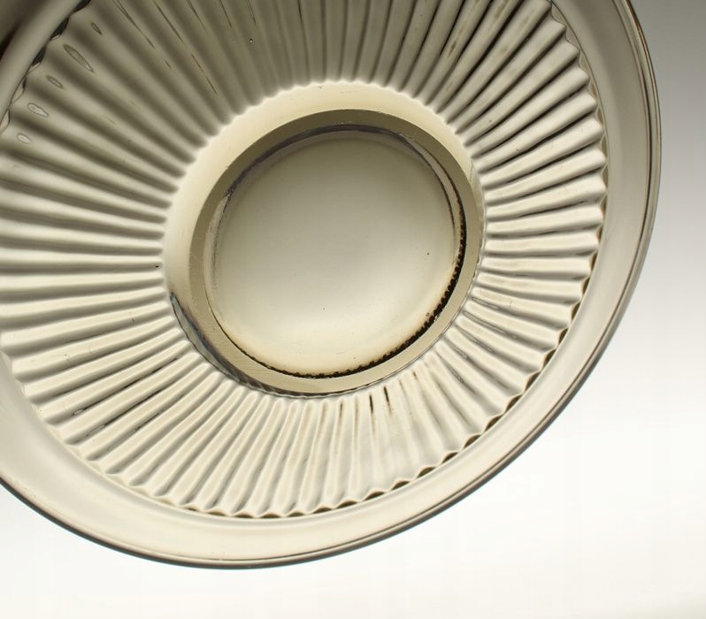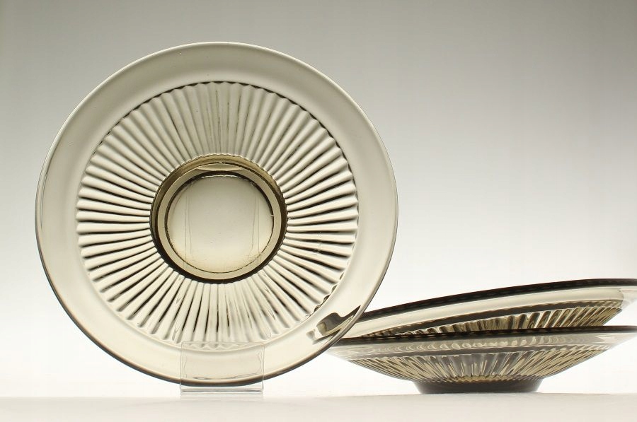 Talerze deserowe wykonane z dymnego szkła prasowanego (1 duży i 3 małe). Kołnierze zdobione reliefem z prążków.