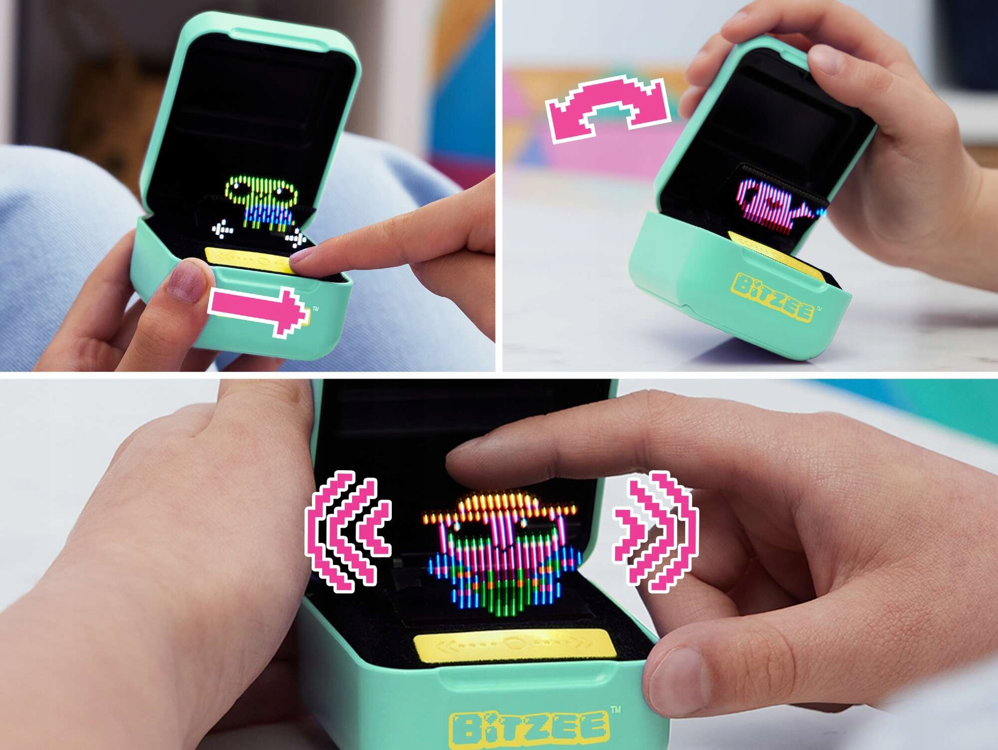 Oto Bitzee: cyfrowe zwierzątko, które możesz dotknąć i poczuć. Interaktywne zwierzaki Bitzee reagują na przeciągnięcia, przechylenia, potrząśnięcia i dotyk dźwiękami i reakcjami! Każdy Bitzee zaczyna jako niemowlę. Podobnie jak prawdziwe zwierzęta, wirtualne zwierzaki Bitzee potrzebują miłości i opieki, aby rosnąć. Im więcej grasz, tym więcej zwierzaków otrzymasz! Karm je i baw się z nimi, kołysz je do snu, sprzątaj po nich i dawaj im miłość. Obserwuj, jak rosną od niemowlęcia, przez dorosłego, do Super Bitzee! Odblokuj wszystkie zwierzaki Super Bitzee i odkryj unikalne stroje i gry, a następnie użyj smakołyków, aby przyciągnąć kolejne wirtualne zwierzątko. Zbierz 15 zwierzaków Bitzee i pochwal się swoją kolekcją znajomym w dowolnym miejscu! Zabawki Bitzee dla chłopców i dziewczynek są idealne dla dzieci, które lubią animacje i elektroniczne zwierzaki, a nawet dorośli będą zahipnotyzowani innowacyjnym, bezekranowym podejściem Bitzee do zabawek i gier z czasów ich dzieciństwa! Interaktywne zabawki Bitzee to świetny i wyjątkowy prezent. Wyjdź poza schematy z Bitzee!