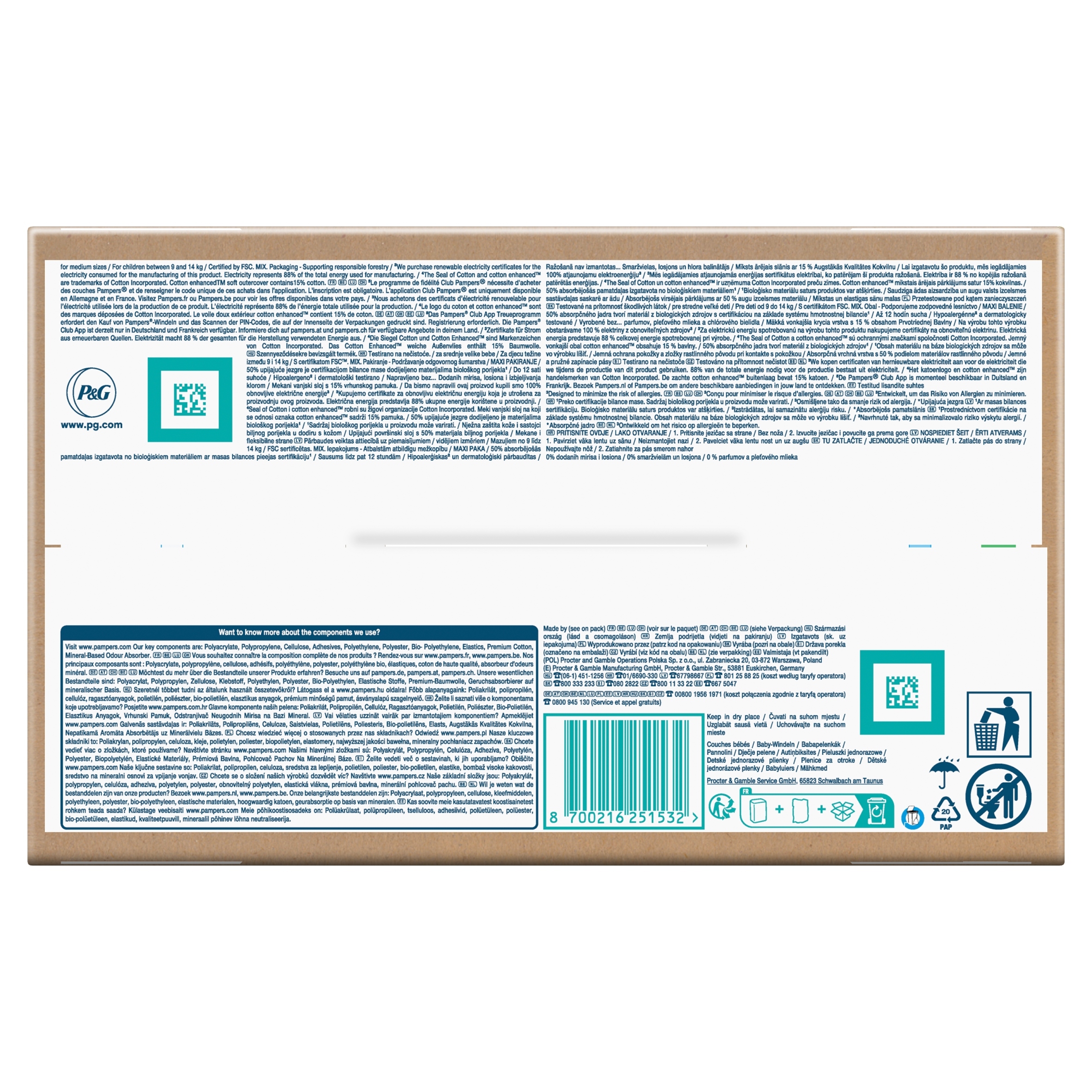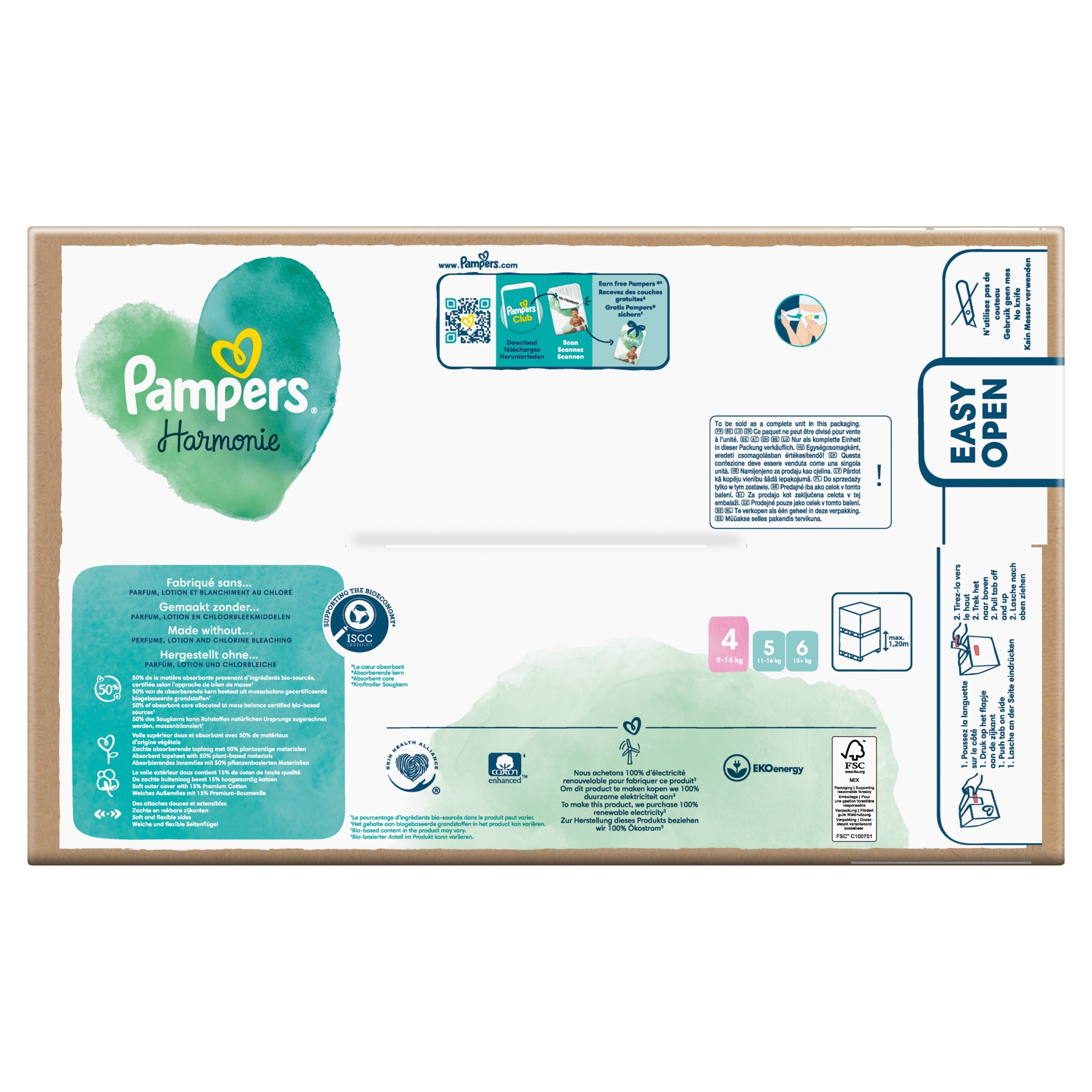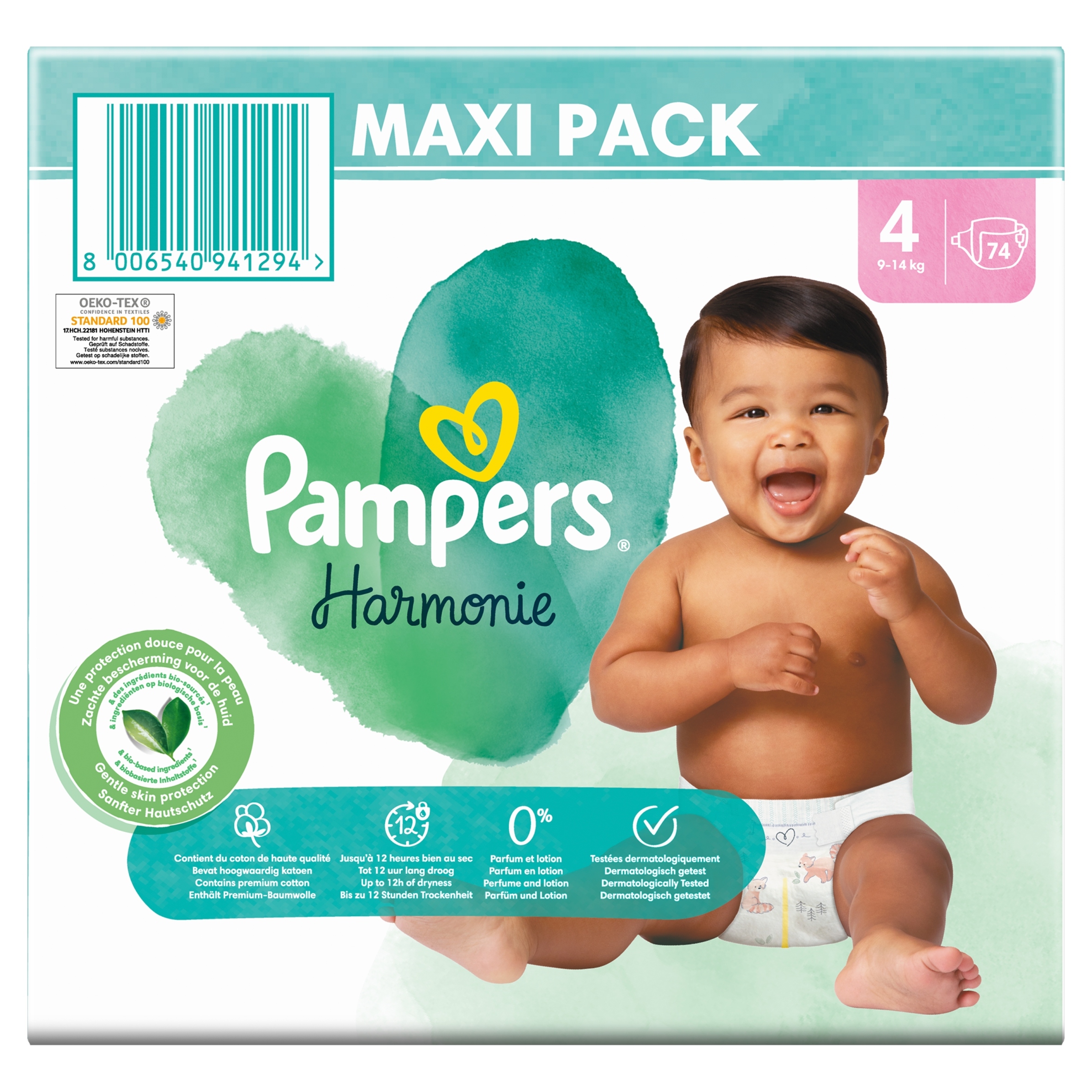 Nie zawierają substancji zapachowych, balsamu i oferują do 12 godzin suchości gwarantowanej przez Pampers, zapewniając jakość, której potrzebuje każdy rodzic. Pieluszki są ozdobione uroczymi nadrukami i mają przydatny wskaźnik wilgotności Pampers, który rodzice i dziecko na pewno pokochają. Pampers Harmonie są wykonane z pozyskiwanej w odpowiedzialny sposób celulozy i posiadają jeden z najbardziej wymagających certyfikatów na świecie, Standard 100, przyznawany przez Oeko-Tex.