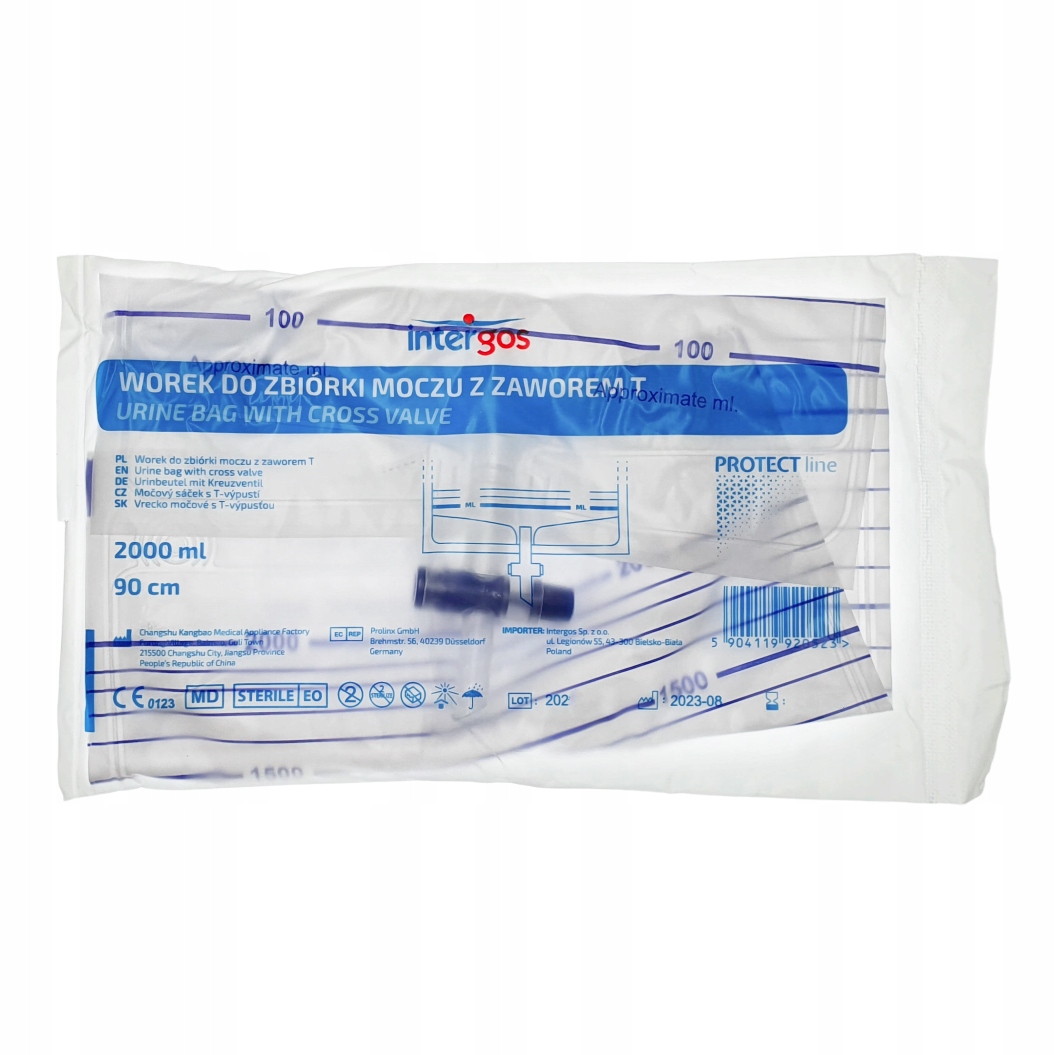 Worek do dobowego, pozaustrojowego zbierania moczu i innych płynów ustrojowych. Worek o pojemności 2000 ml jest wykonany z PVC. Posiada szczelny zawór spustowy szybkiego opróżniania typu poprzecznego (T). Dren łączący zakończony został uniwersalnym łącznikiem schodkowym, długość drenu to 90 cm. Każdy worek pakowany jest sterylnie.