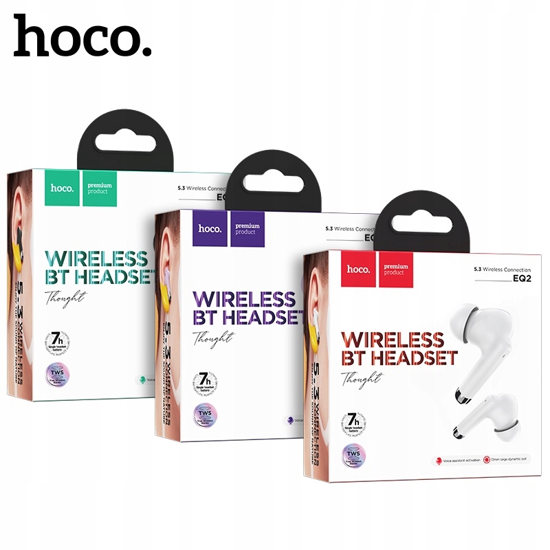 hoco. EQ2 Thought to bezprzewodowe, bezkablowe słuchawki dokanałowe w technologii Bluetooth 5.3 TWS, wyposażone w etui służące jako ładowarka z bateriąo pojemności 320mAh. Same słuchawki posiadają baterię o pojemności 40mAh każda. Słuchawki posiadają mikrofon dający możliwość prowadzenia rozmów telefonicznych oraz przyciski dotkowe do sterowania muzyką lub połączeniami telefonicznymi i rozmowami. Mają wewnętrzne głośniki o średnicy 13mm dające bardzo ładny, czysty dźwięk jak na swoją cene i wartość.