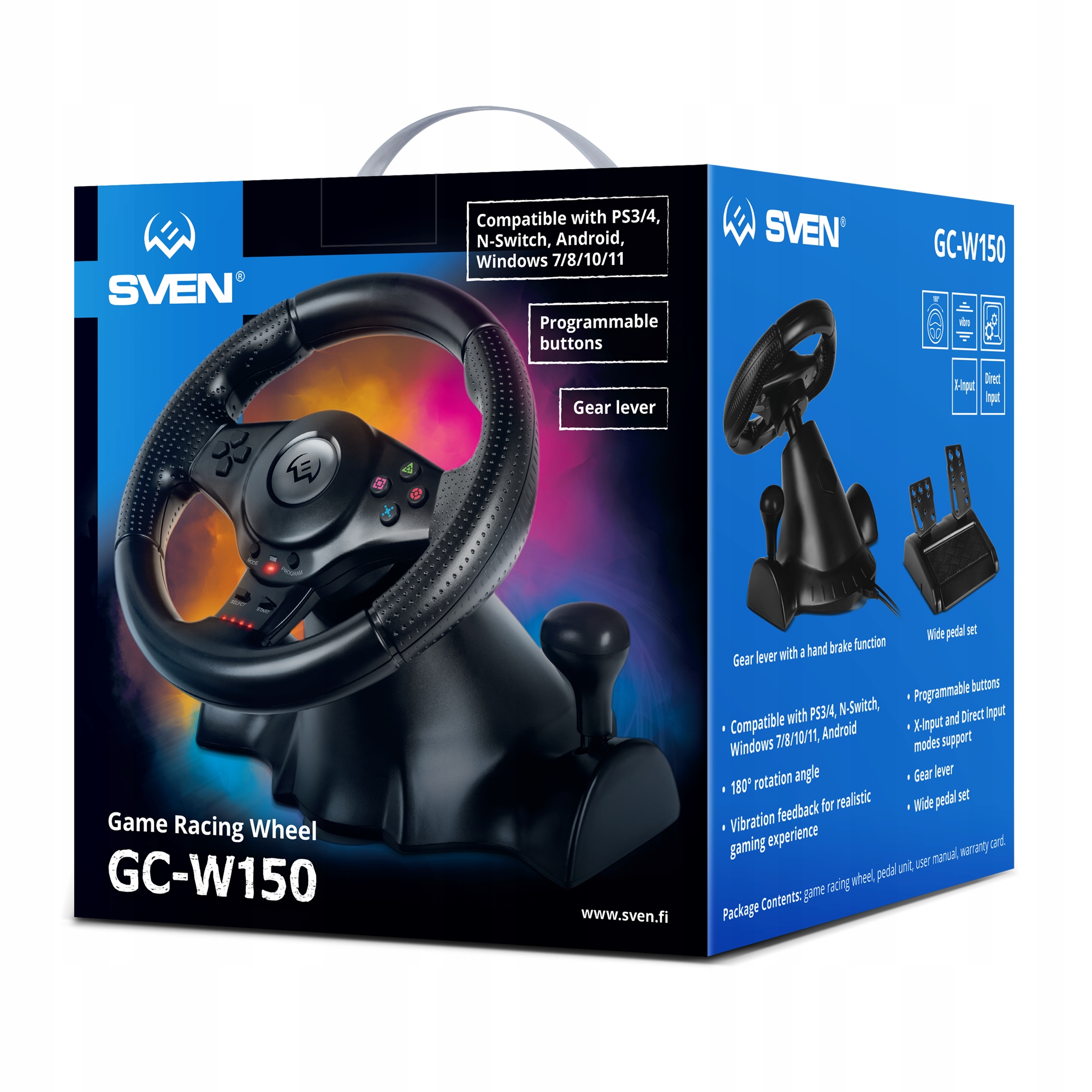 Zaletą kierownicy SVEN jest to, że wyposażona we wszystko, co potrzebne, pozostaje przystępna cenowo dla szerokiego grona potencjalnych nabywców. Przede wszystkim warto wspomnieć o jego wszechstronności: poza komputerami z systemem Windows 7 i starszymi, z łatwością współpracuje z PS4 i PS3, NintendoSwitch, a nawet z gadżetami z Androidem. A ponieważ obsługuje tryby X-Input i D-Input, za pomocą GC-W150 możesz grać w różnorodne gry, w tym gry, które zostały wydane dawno temu i stały się już klasykami.