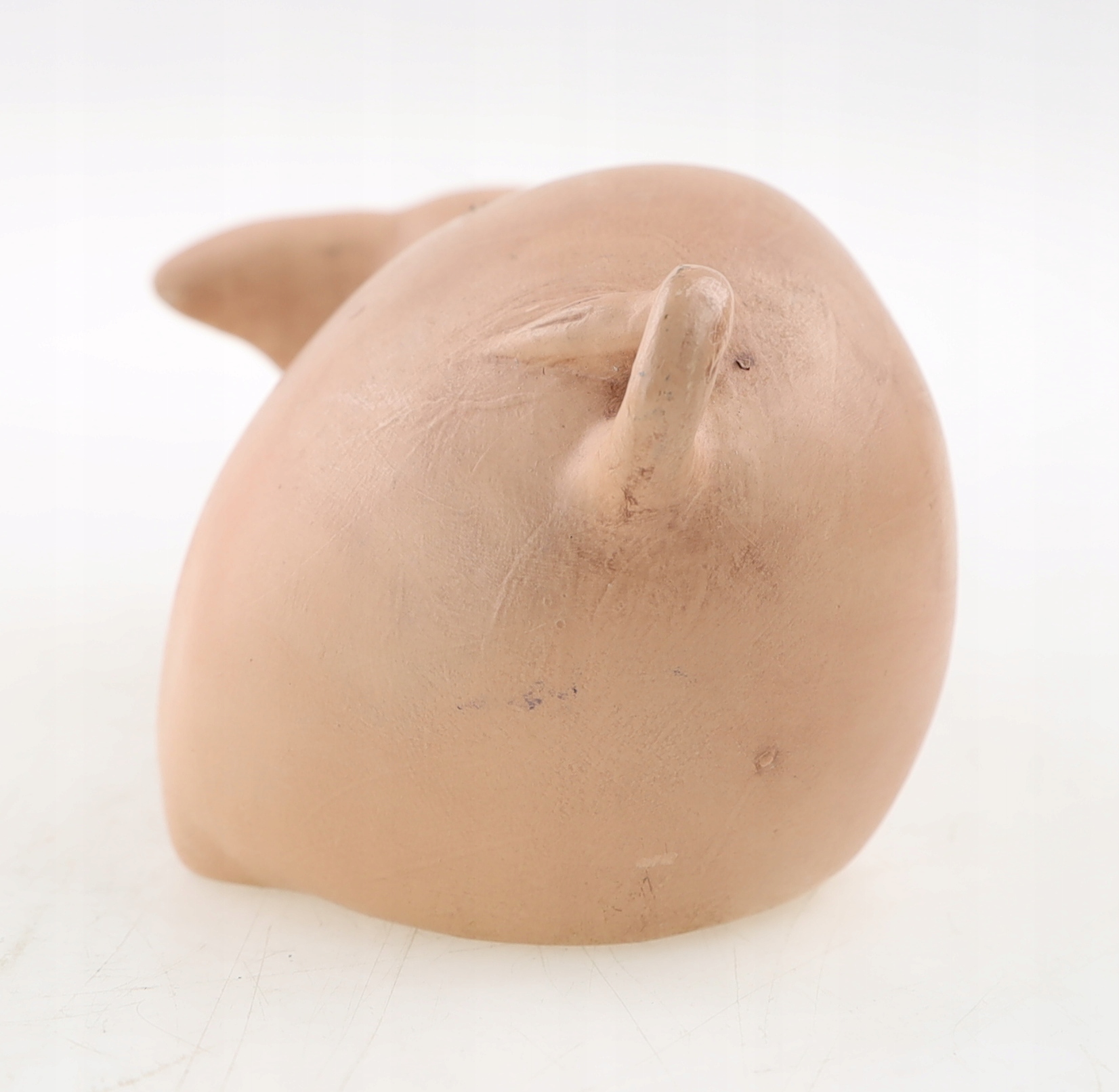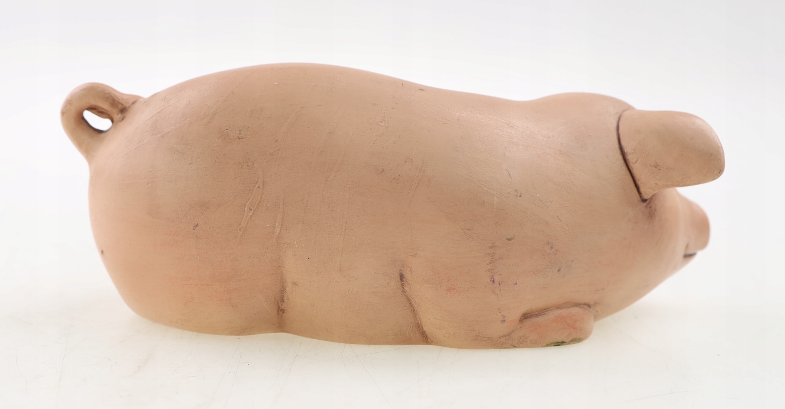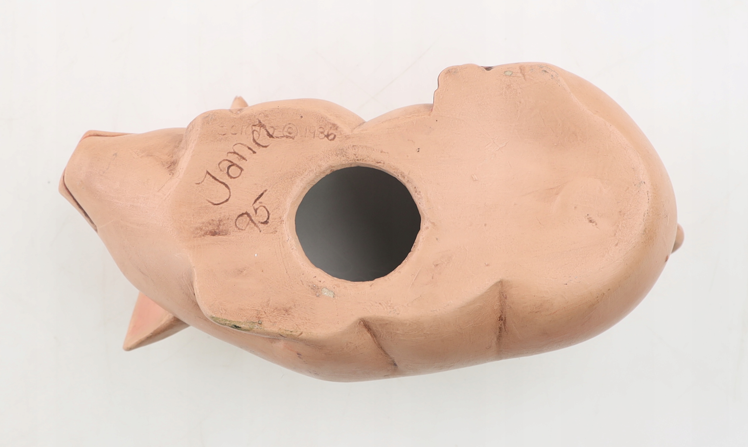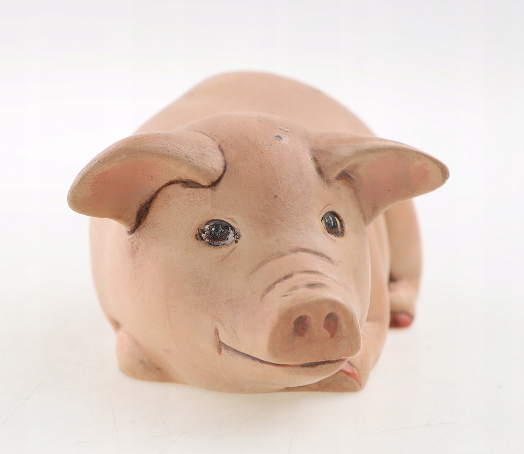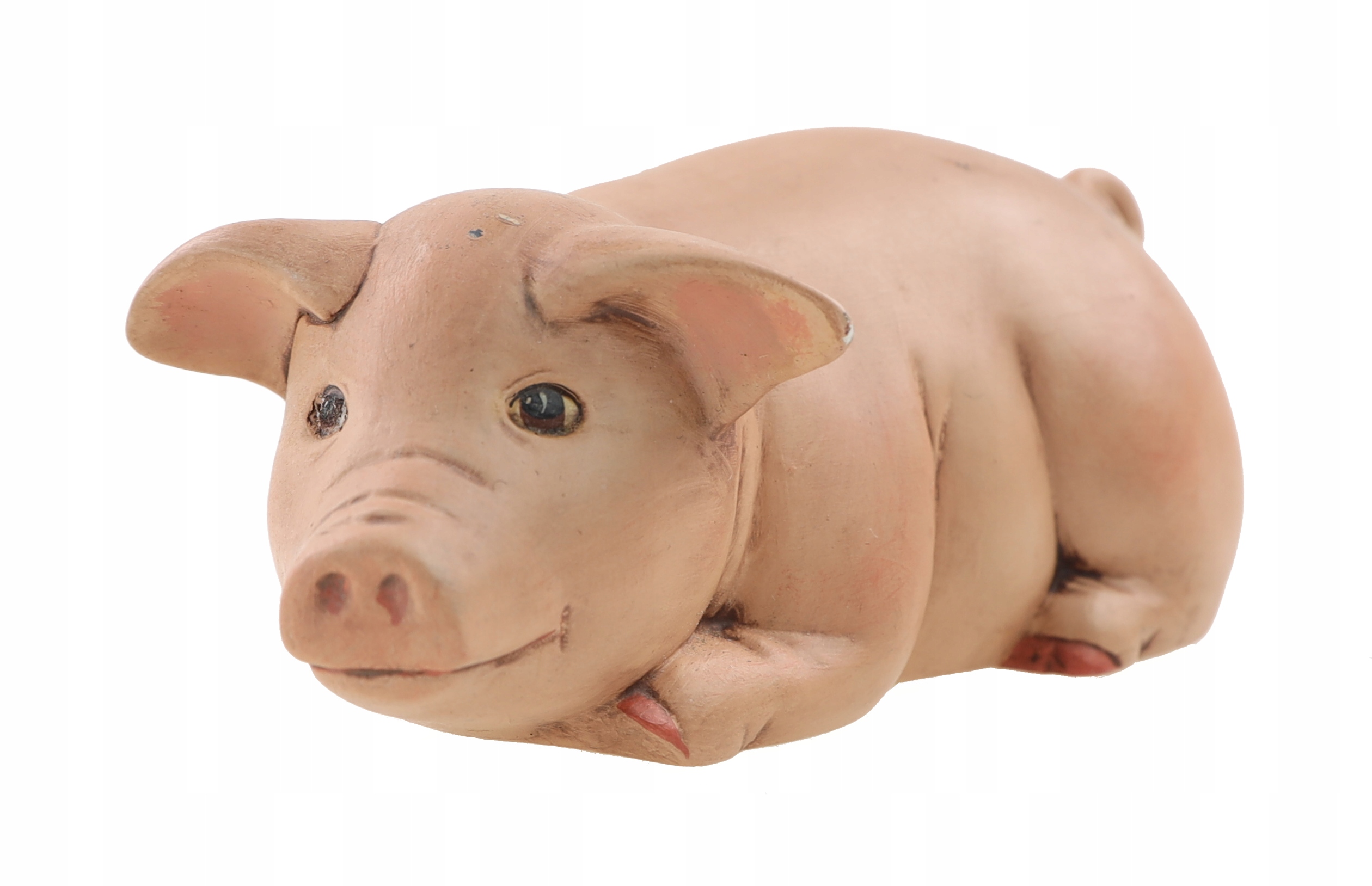 Ceramiczna figurka, przedstawiająca leżącą świnkę. Sygnowana. Jedna sygnatura nieczytelna a druga "Janet 95". Ślady użytkowania. Polecam