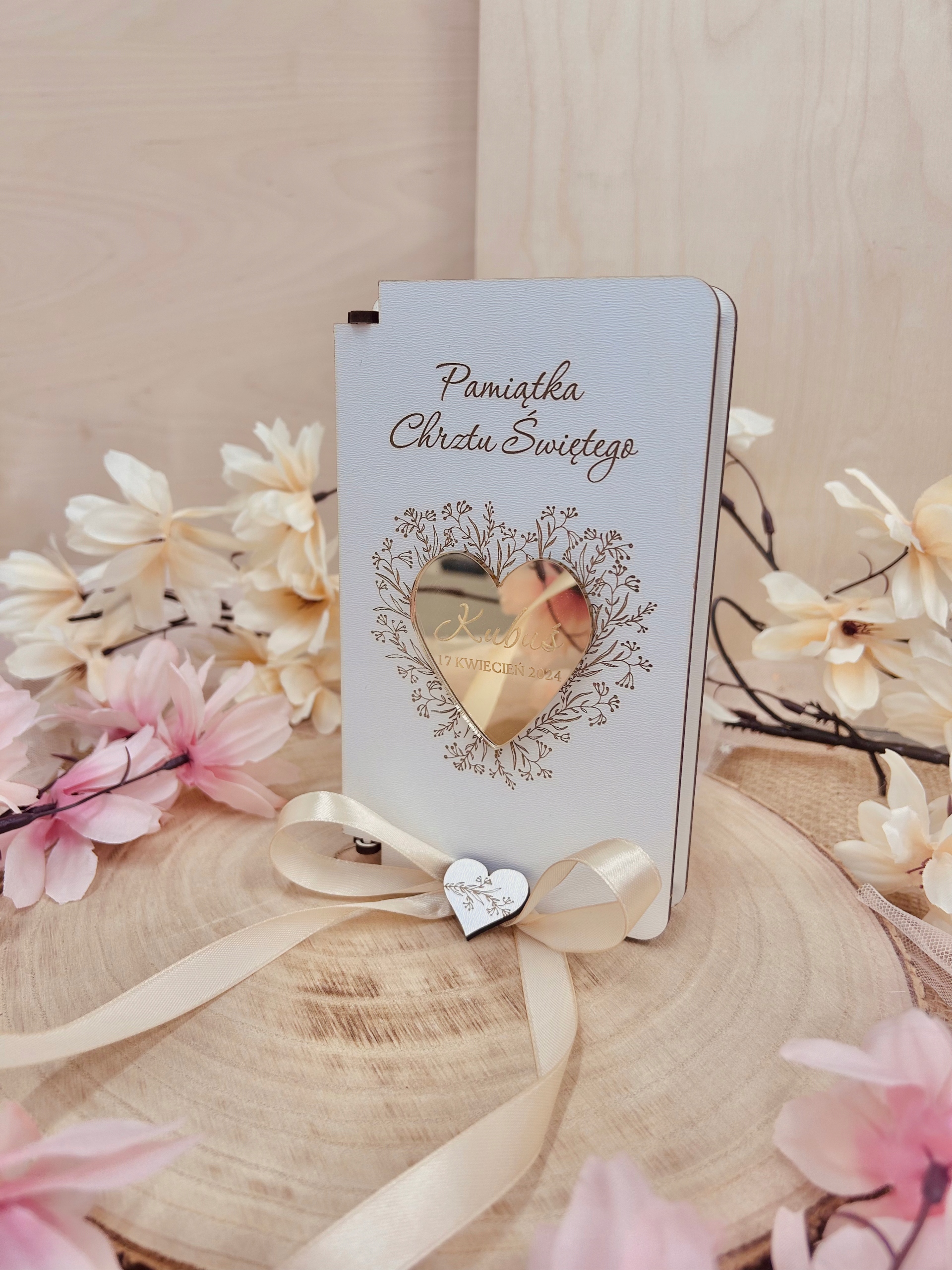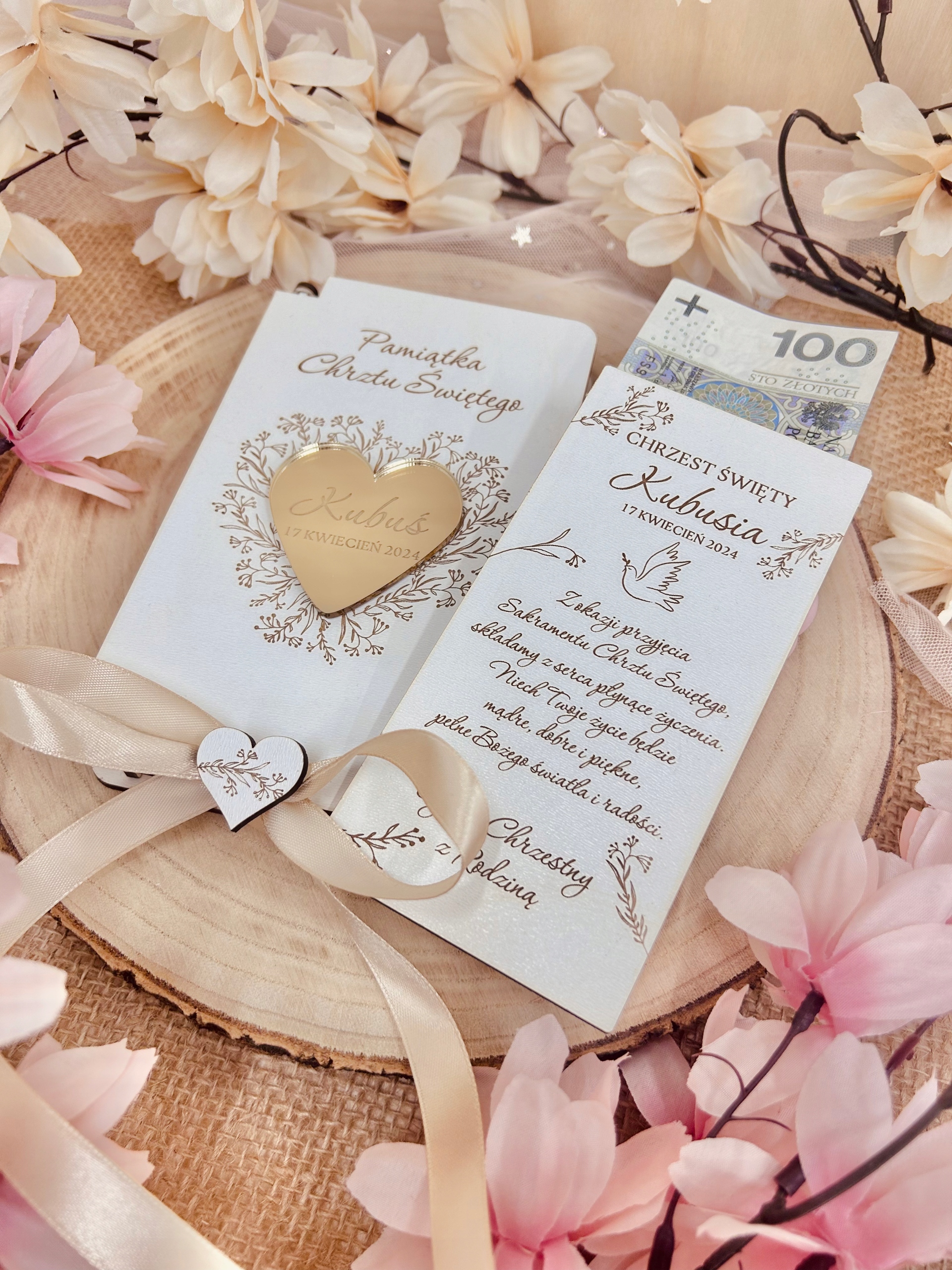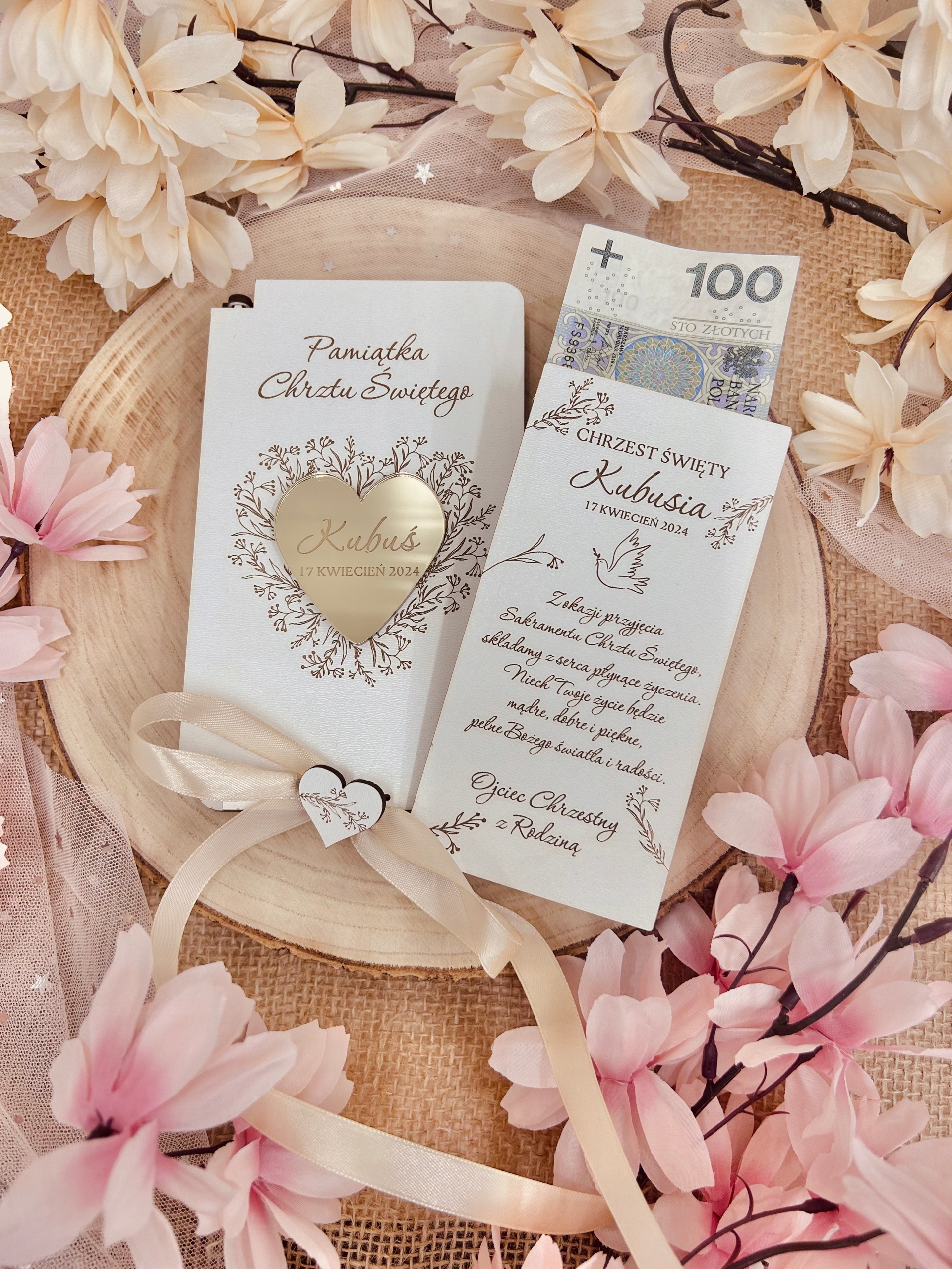 W в коробке находятся пожелания и подпись, которые подлежат персонализации. В коробку поместится банкноты и другие небольшие подарки, например, цепочка. Снаружи коробки выгравировано имя ребенок и дата торжества.
