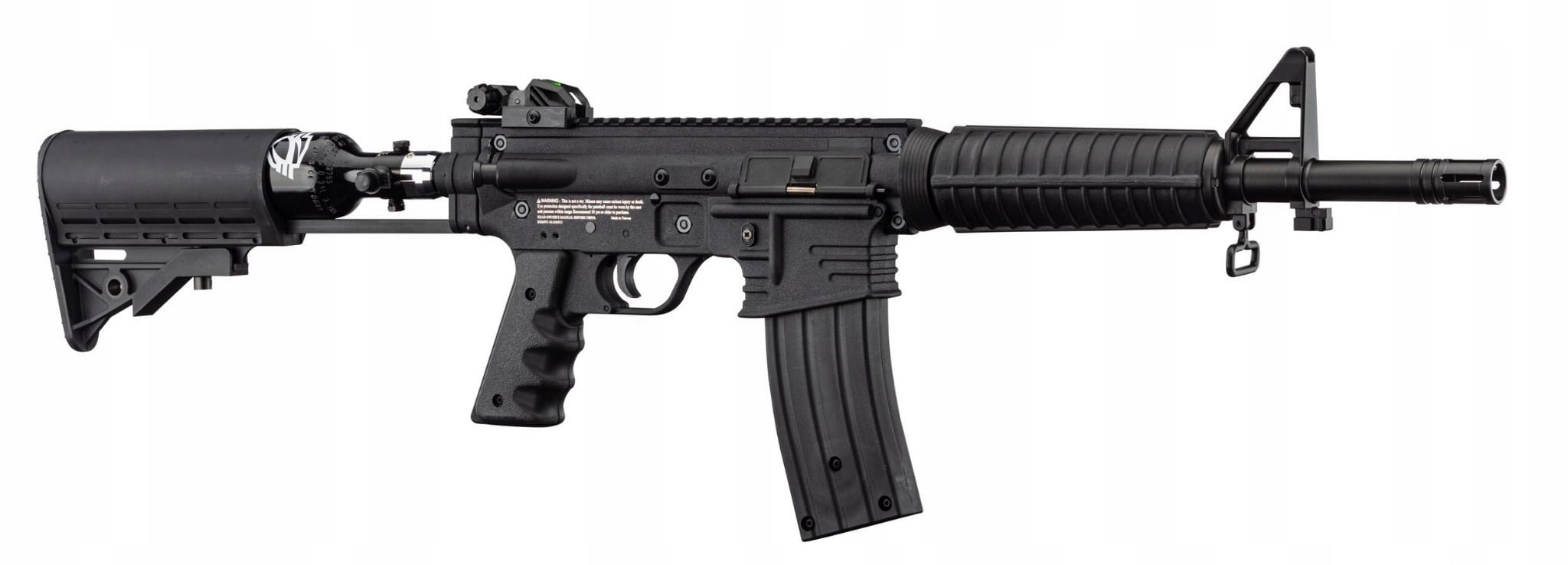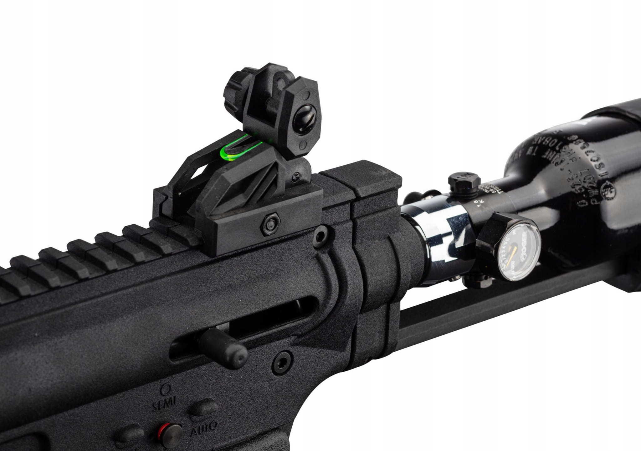 Стилизованный под M16, имеет монтажные рельсы и кронштейн транспортный, алюминиевый корпус дизайн. Имеет ствол с резьбой А5, держатель для транспортировочного ремня, в в комплекте 3 магазина по 15 пуль каждый. Предназначен для питания от цилиндра HP 0,2 л, убирающегося в регулируемая колба (цилиндр в комплекте).
