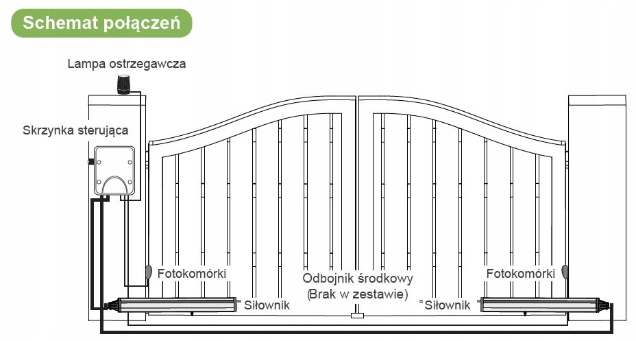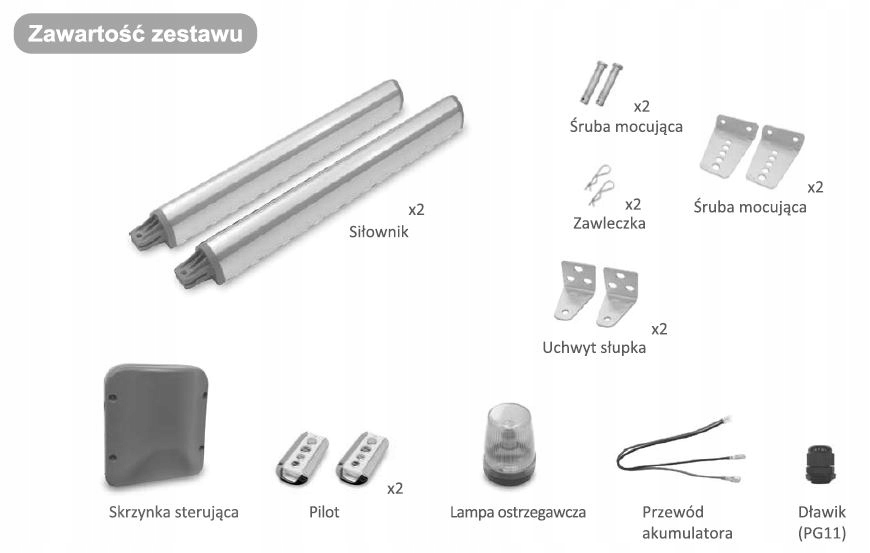 Kompletny zestaw automatyki do bram dwuskrzydłowych uchylnych o ciężarze do 150 kg na jedno ramię.