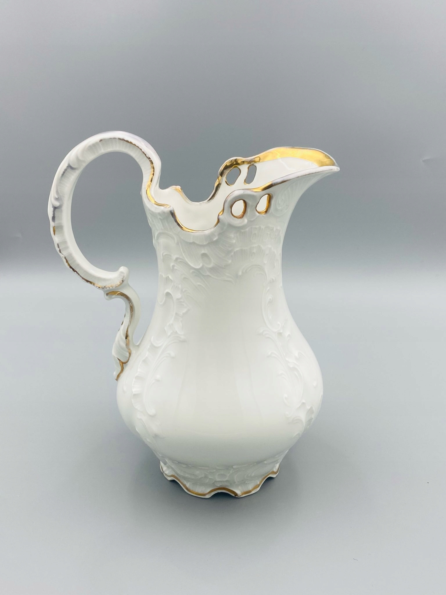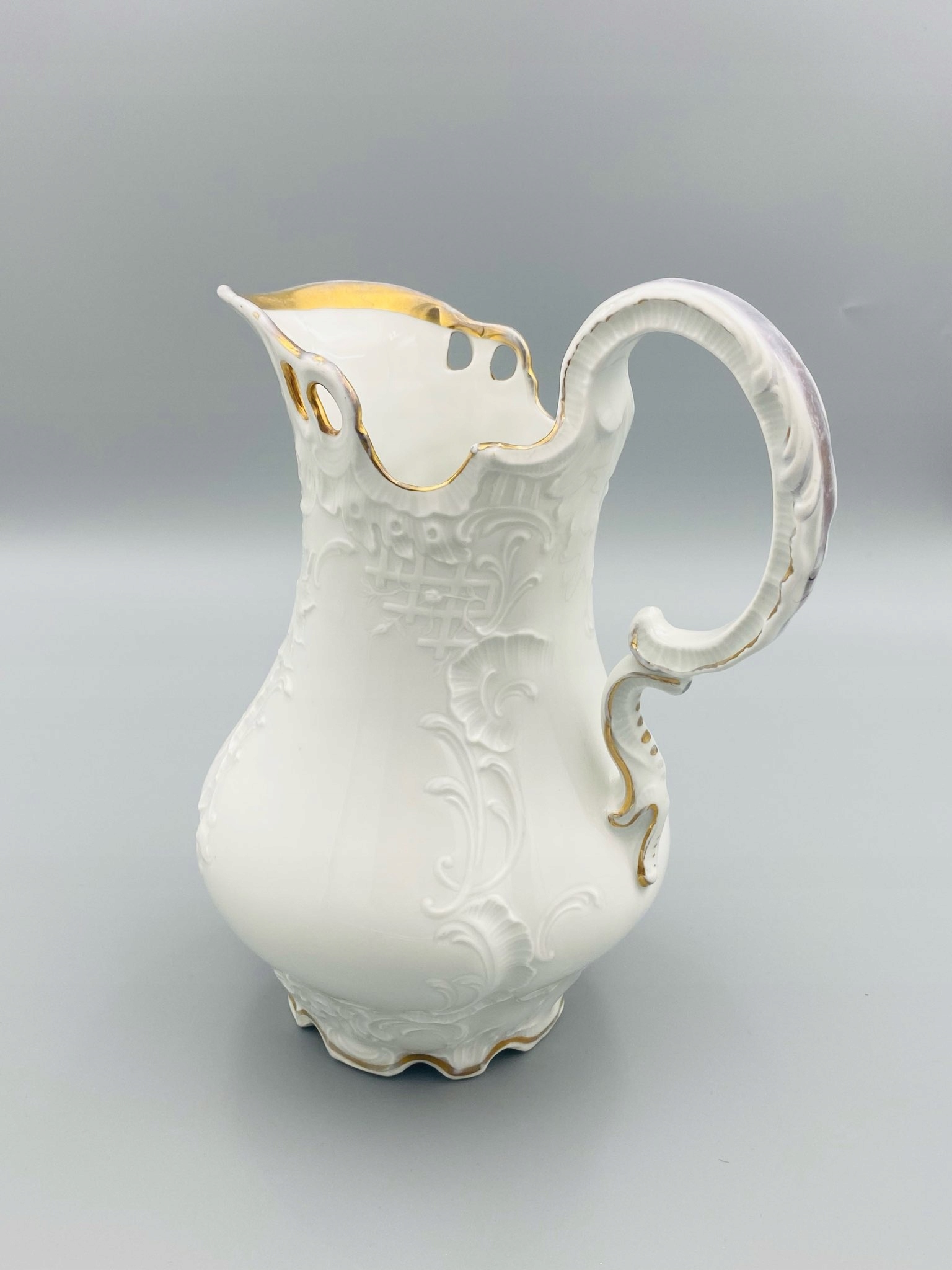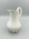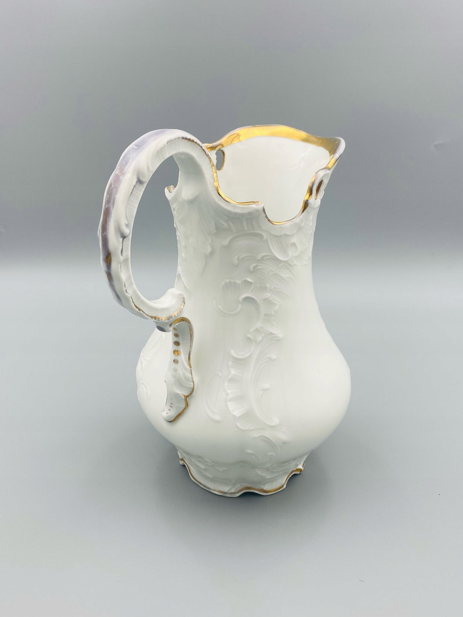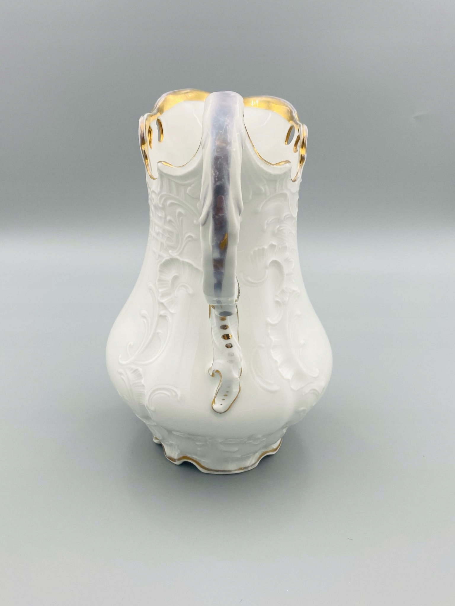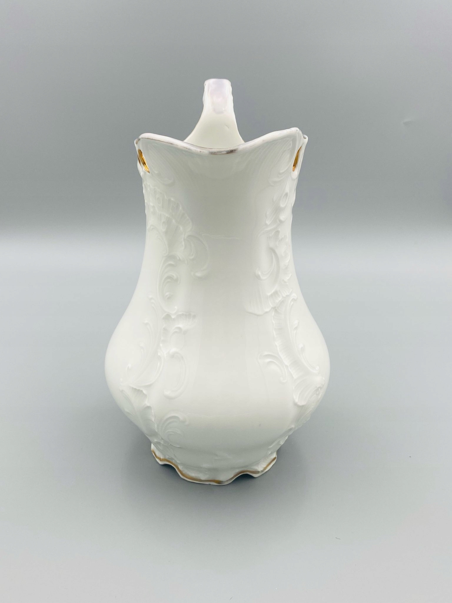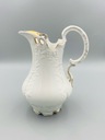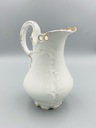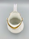 Złocona ręcznie biała porcelana, dekorowana wytłoczeniami. Wyprofilowany duży uchwyt.