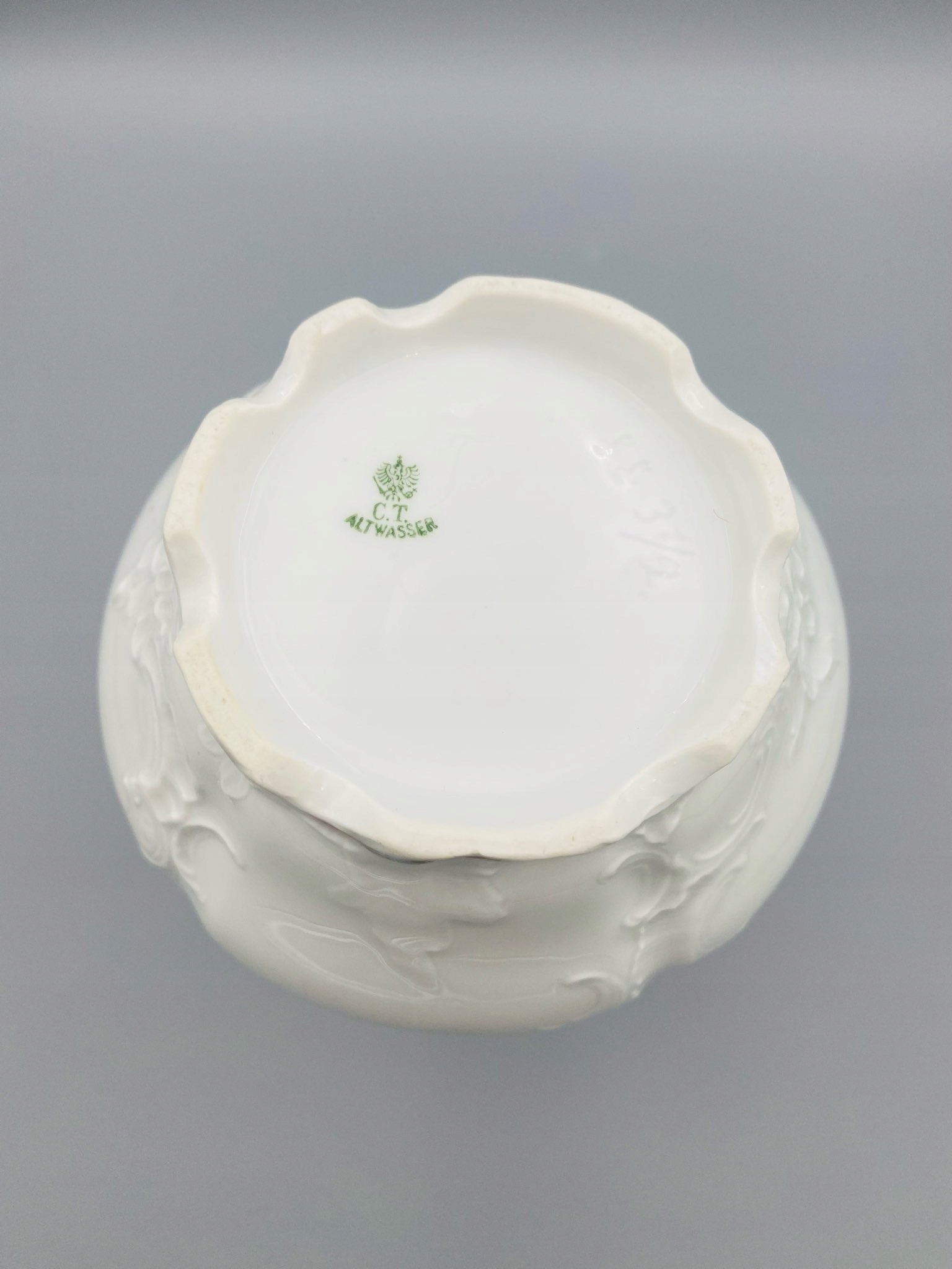 Sygnatura: Zielony orzeł C.T. z berłem z śląskiej manufaktury Carla Tielscha z Altwasser ( Stary Zdrój) , stosowana od 1875 r. Sygnatury widoczne na ostatnim zdjęciu.