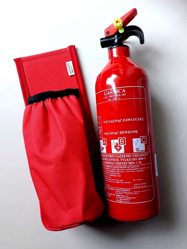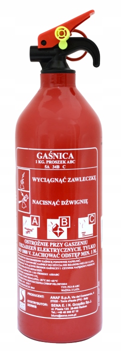 Gaśnica proszkowa 1 kg ABC (8A 34B C) przeznaczona do zabezpieczenia samochodów osobowych, przyczep kempingowych, łodzi motorowych, żaglowych, do użytku domowego itp.