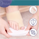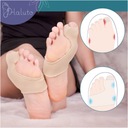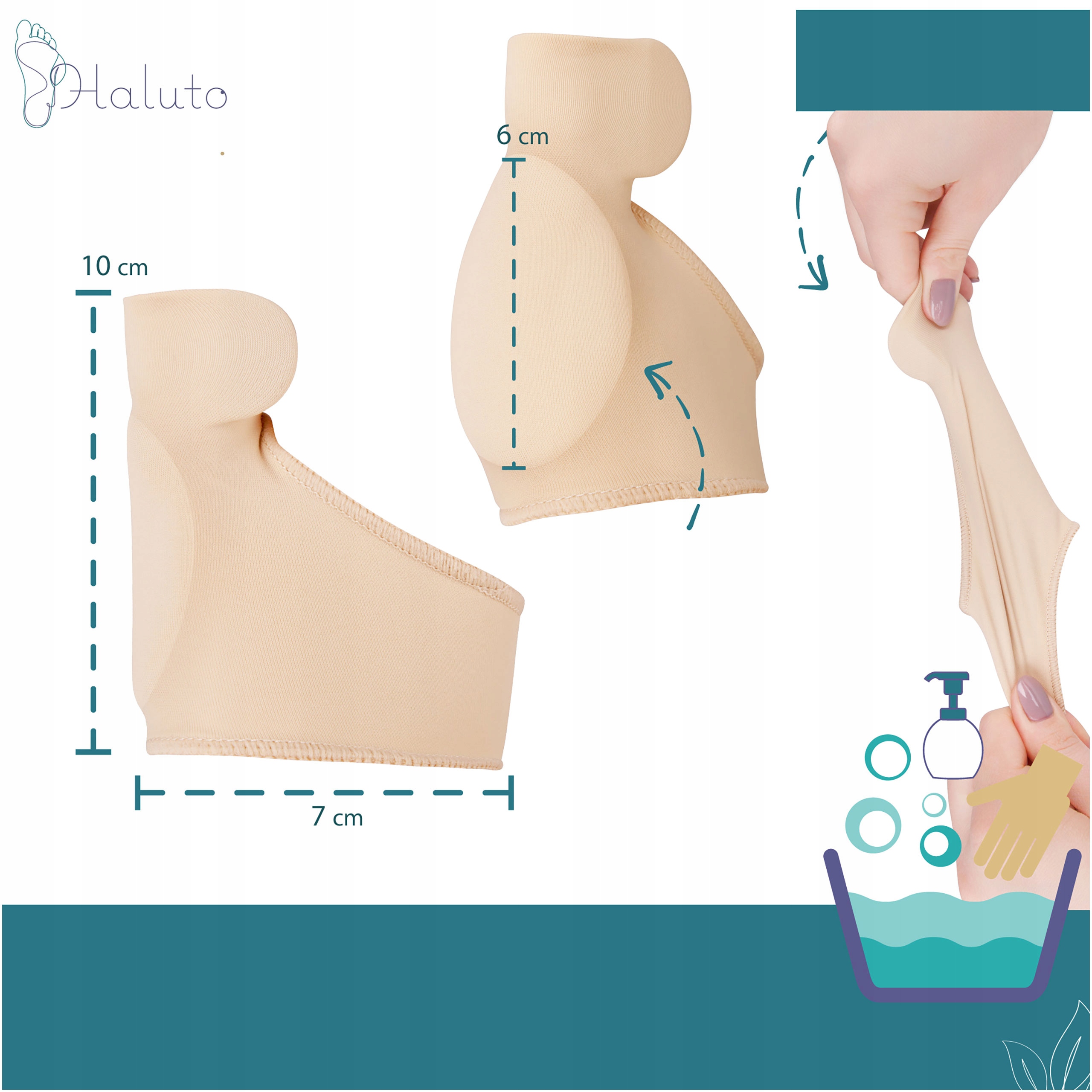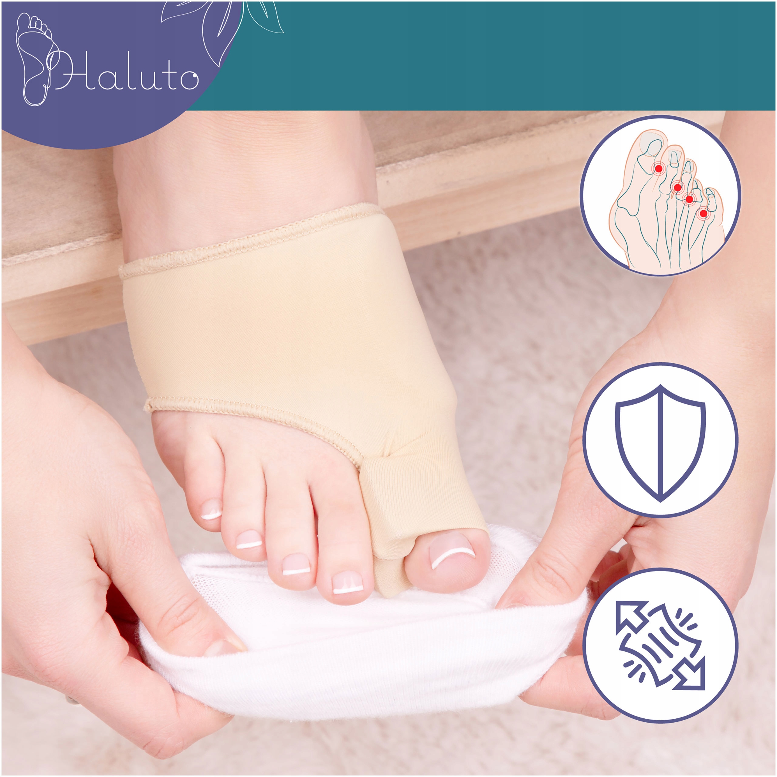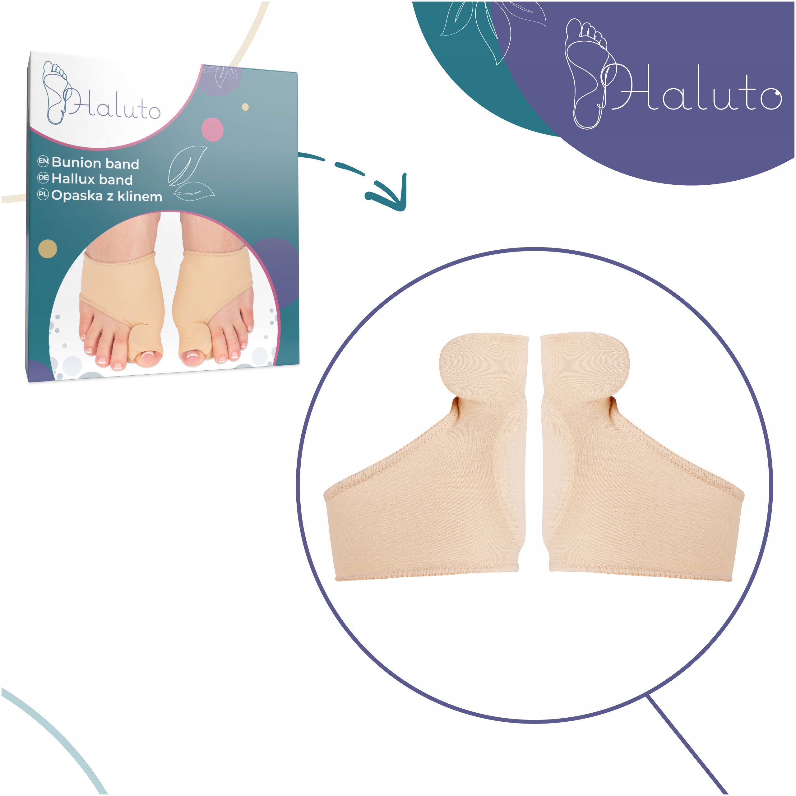 Opaska wykonana z miękkiej tkaniny, wyposażona jest w żelowy klin, który skutecznie separuje duży palec stopy. Klin umieszczony w opasce poprawia jej funkcjonalność oraz trwałość. Dodatkowo, opaska posiada silikonową osłonę na halluksy, która zabezpiecza przed otarciami, doskonale chroniąc przednią część stopy. Łatwo dopasowuje się do kształtu stopy, skutecznie absorbując nacisk i przynosząc ulgę w przypadku bolesnego guza. Można je nosić w dowolnych butach.
