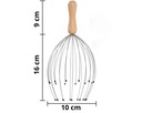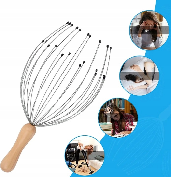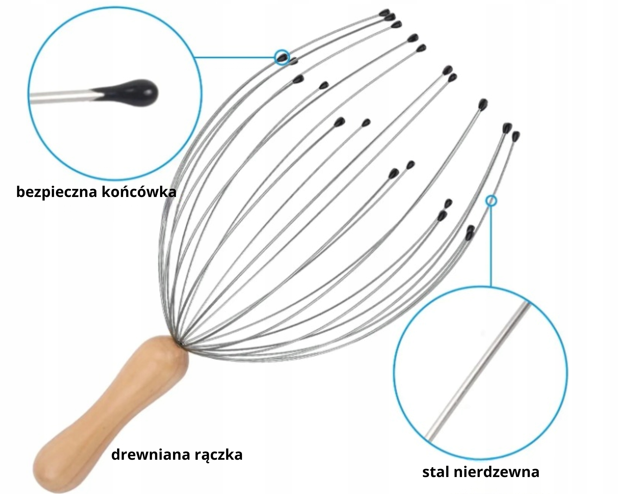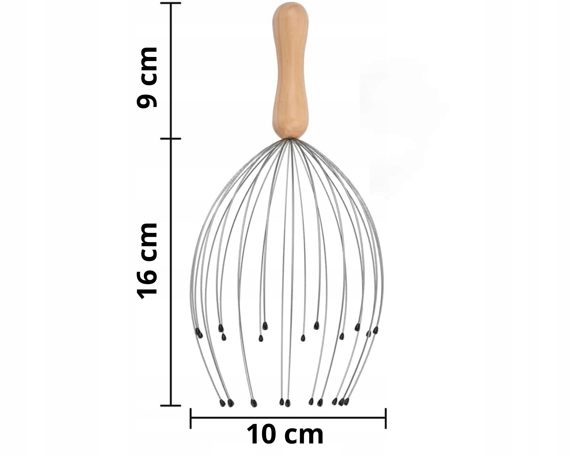 Masażer jest niezwykle łatwy w obsłudze. Wystarczy umieścić go na głowie i rozpocząć kojący masaż. Wykonany ze starannością o każdy detal. Solidny i wytrzymały składa się z wygodnego drewnianego uchwytu oraz 24 specjalnych pręcików, wykonanych ze stali nierdzewnej, zakończonych kulką.