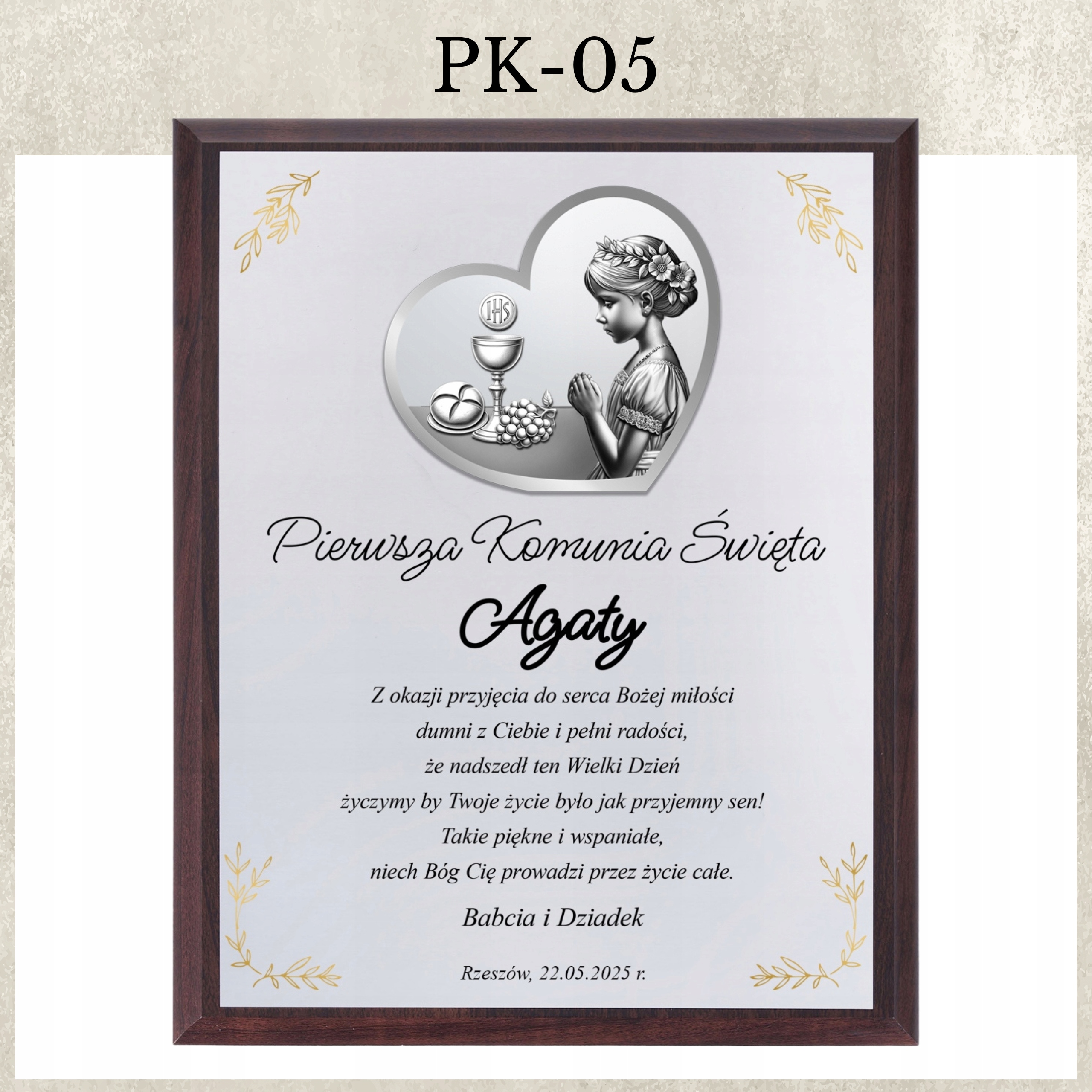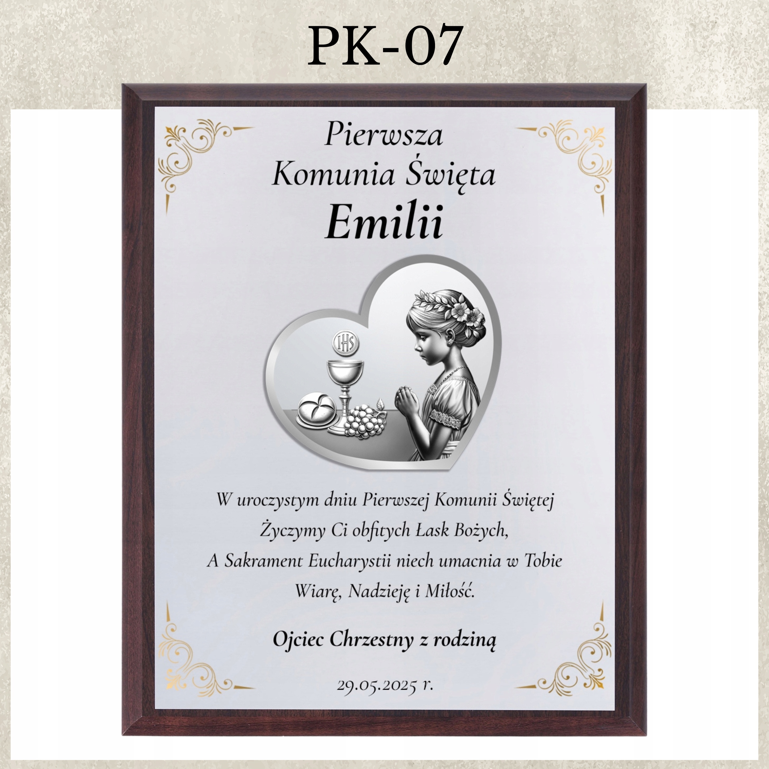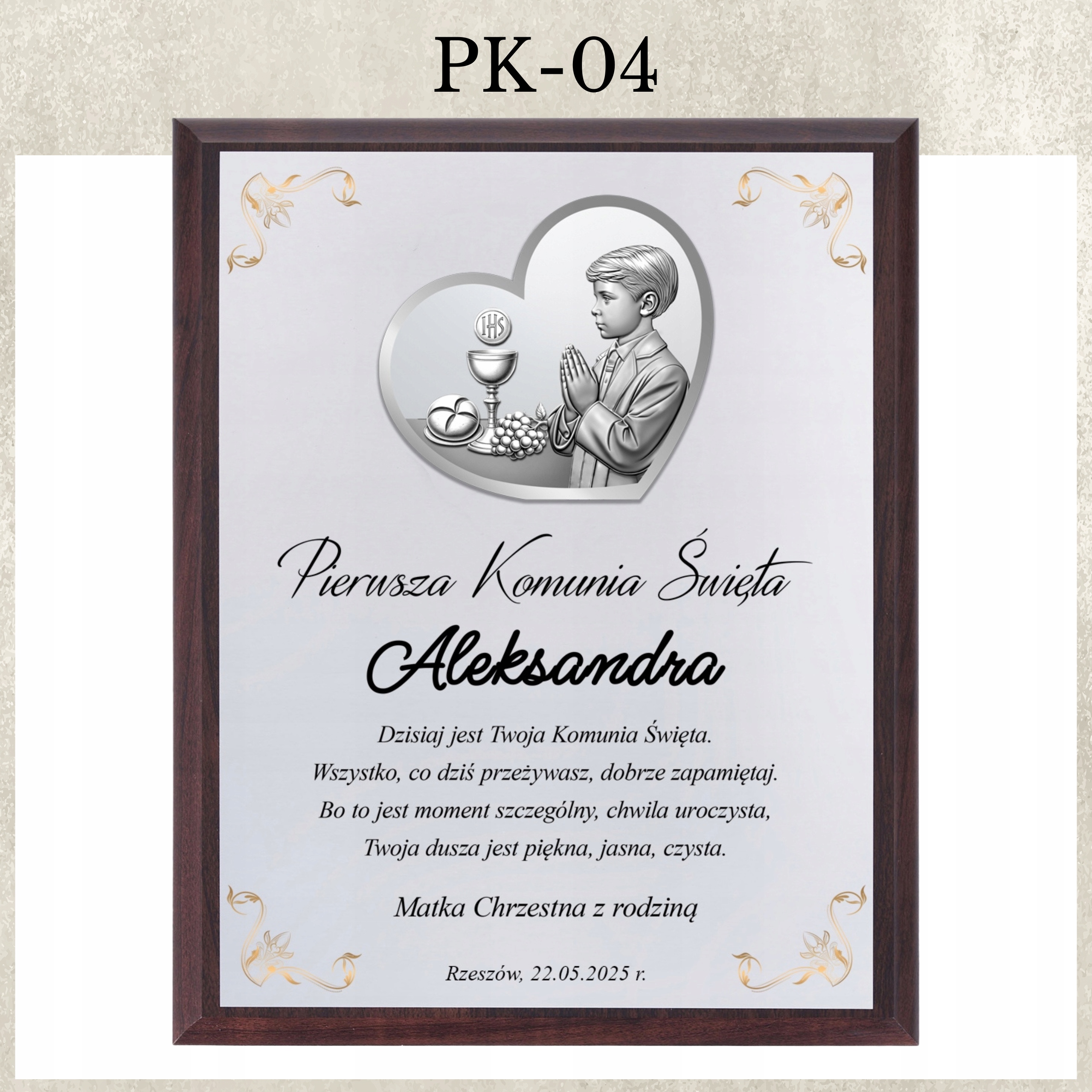 Obrazek 3D z personalizowaną dedykacją to wyjątkowa pamiątka Pierwszej Komunii Świętej. Wykonany w nowoczesnej technologii SLP – Silver-Layer-Printer, charakteryzuje się trwałością oraz niezwykłym efektem głębi.