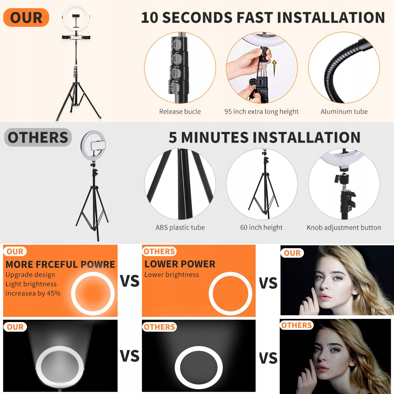 【Z przenośnym statywem i wężem】: Stojak świetlny wykonany jest z wysokiej jakości stopu aluminium, można regulować wysokość od 87cm do 202cm. Elastyczna rura sprawia, że światło obraca się o 360 ° swobodnie, a światło pierścieniowe można obracać o 180 °, spełniając Twoje potrzeby pod dowolnym kątem.