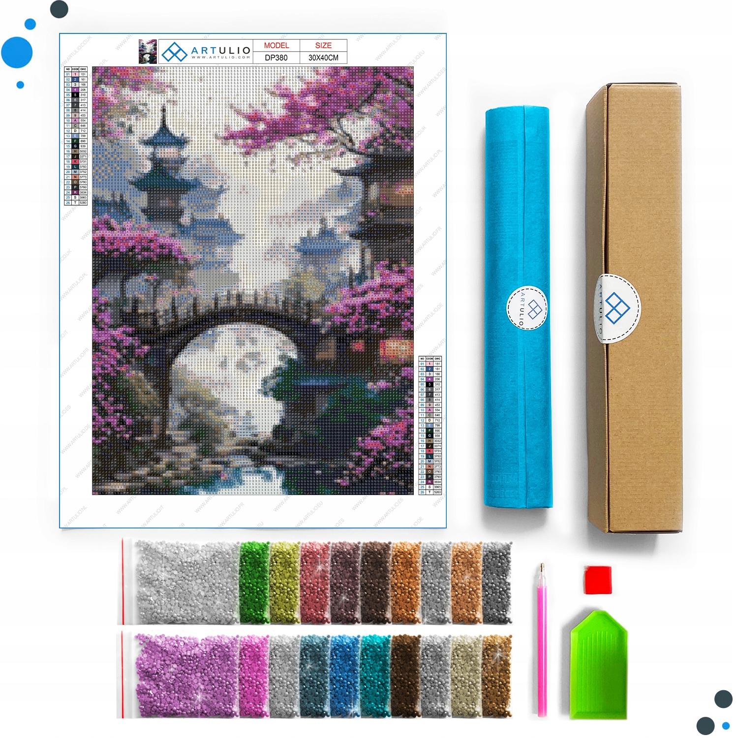 Płótno - wykonane jest ze sztywnej, wytrzymałej tkaniny. Na płótnie naniesiona jest grafika z symbolami wskazującymi miejsca gdzie należy ułożyć poszczególne kolory. Całość pokryta jest warstwą specjalnego kleju zabezpieczonego folią ochronną.
