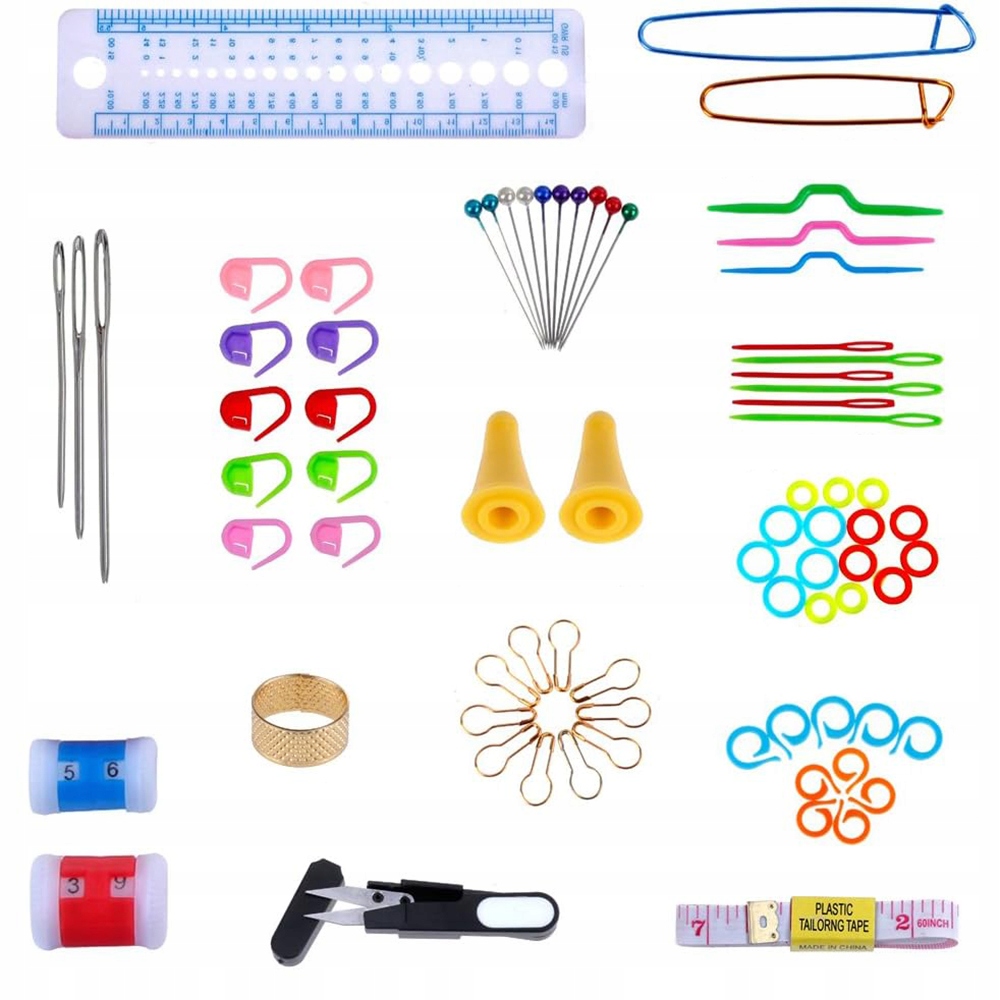 ⭐ Zestaw zawiera liczne dodatkowe akcesoria, takie jak nożyczki, miarka, licznik rzędów, igły do szydełkowania, markery do oznaczania punktów, oraz wiele innych, co czyni go kompletnym narzędziem miłośników szydełkowania.