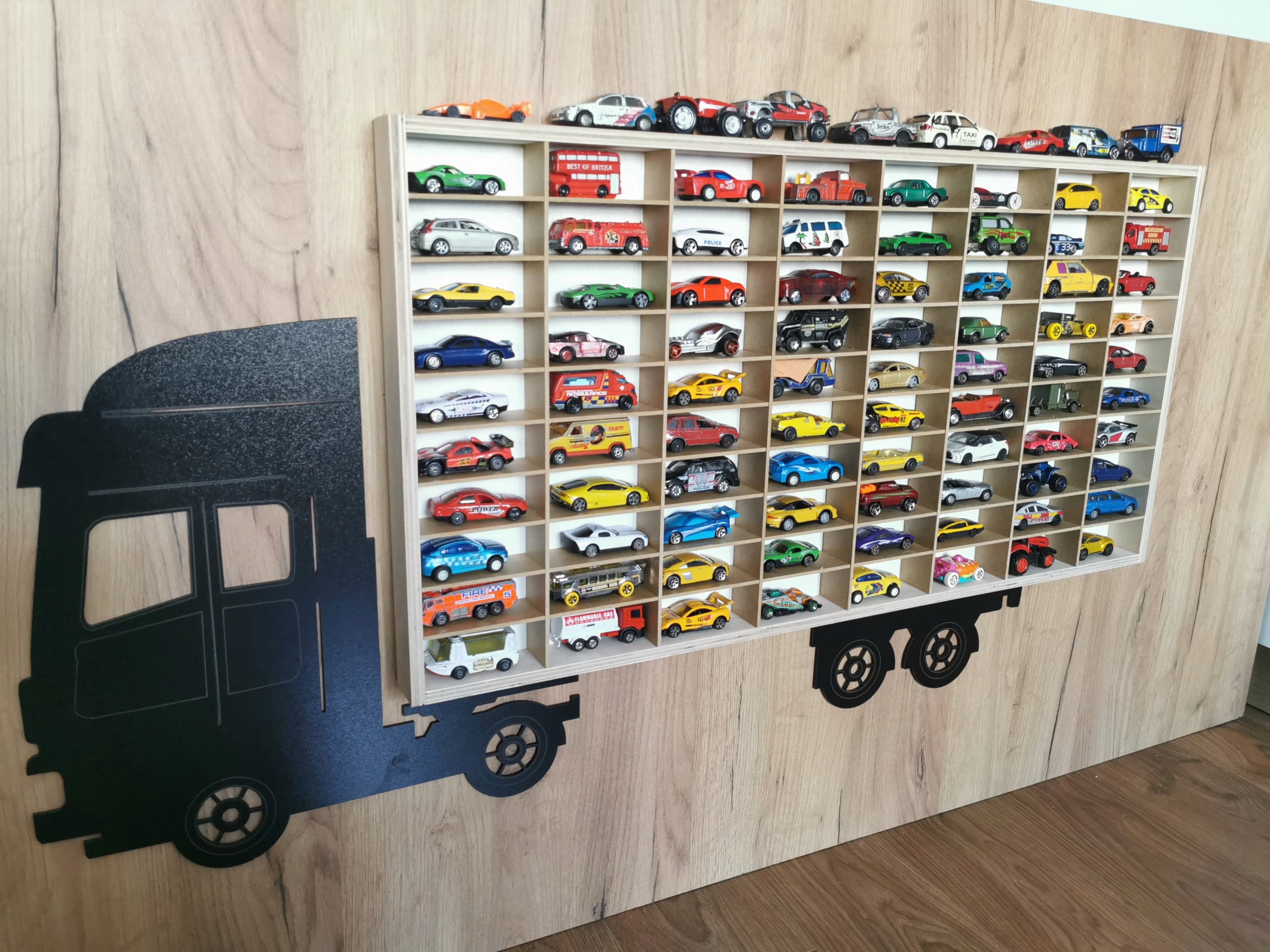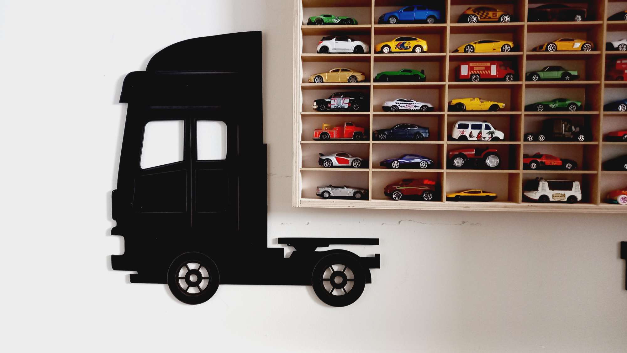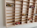 Przedstawiamy solidną drewnianą półkę z przegródkami na samochodziki.