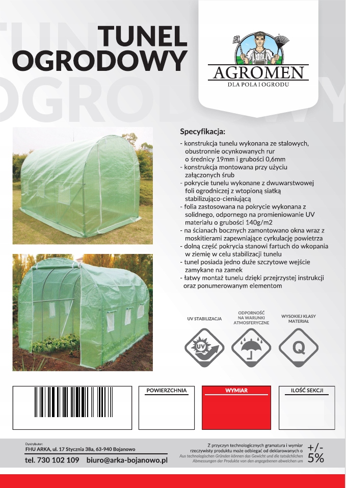 Pokrycie tunelu wykonane z dwuwarstwowej folii ogrodniczej z wtopioną siatką stabilizująco-cieniującą. Folia zastosowana na pokrycie wykonana z solidnego, odpornego na promieniowanie UV materiału o grubości 140g/m2