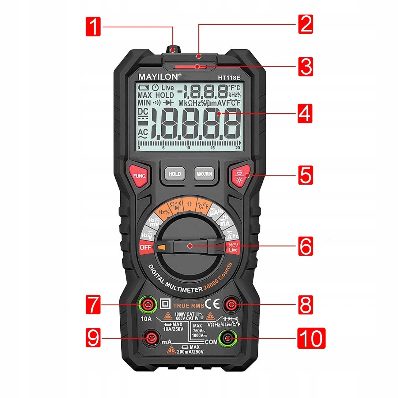 HT118E zachwyca prostotą obsługi i czytelnym wyświetlaczem LCD. Wyniki pomiarów są prezentowane w sposób przejrzysty, a podwójne podświetlenie zapewnia komfort pracy w każdych warunkach. Dla bezpieczeństwa, zmiana koloru na pomarańczowy sygnalizuje przekroczenie wartości napięcia 80 V lub natężenia 1 A.