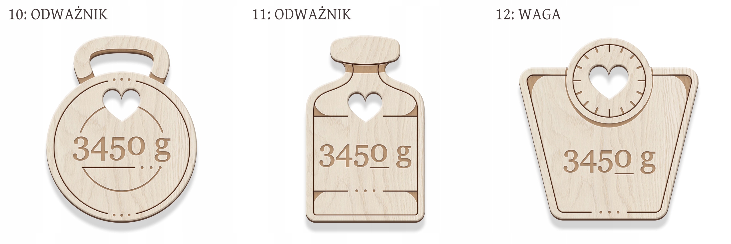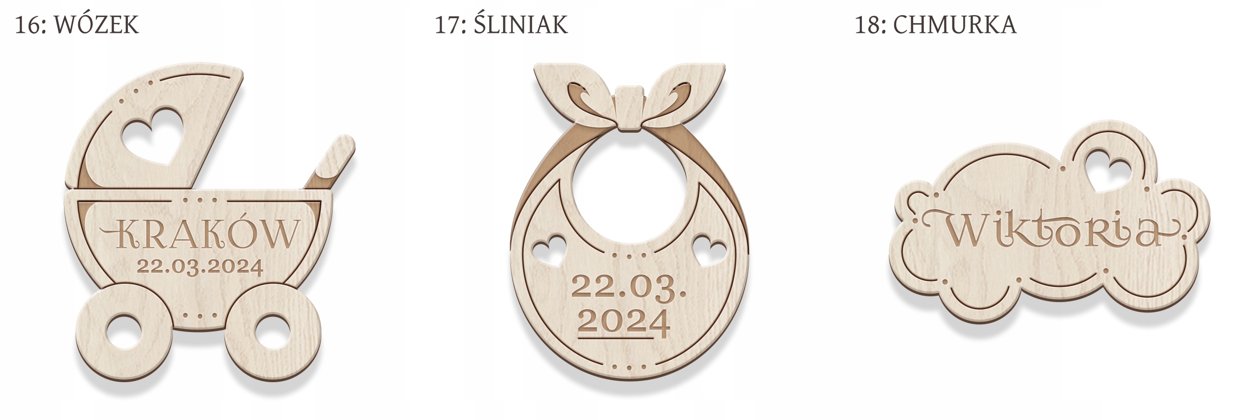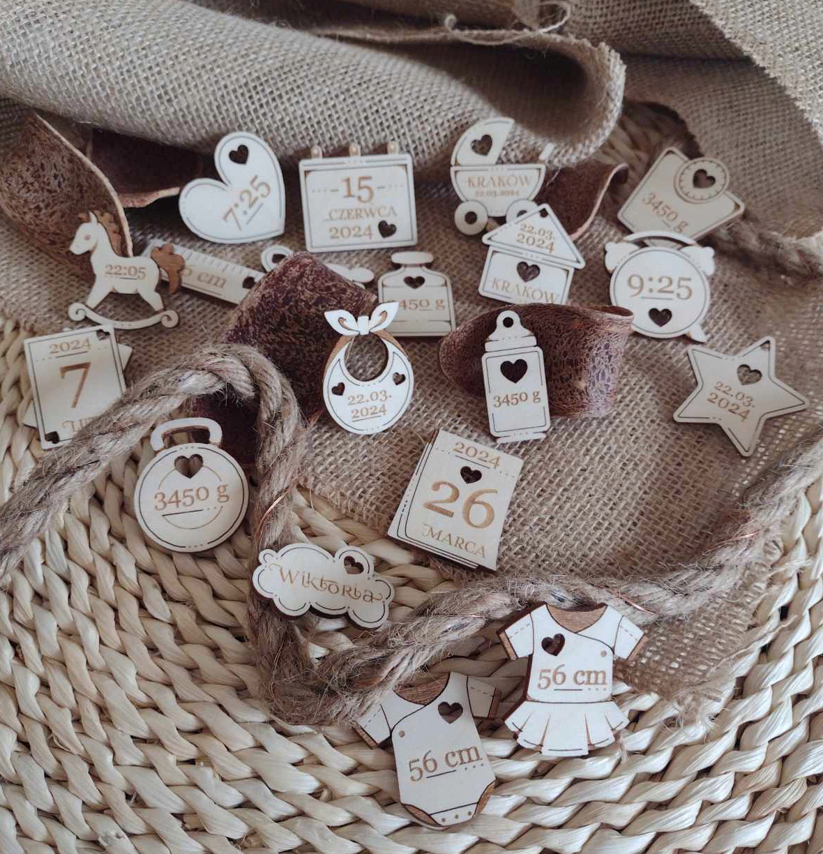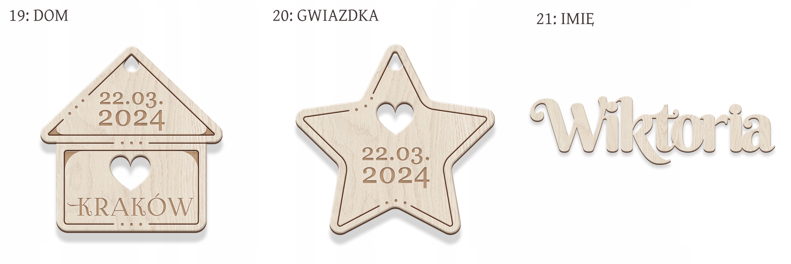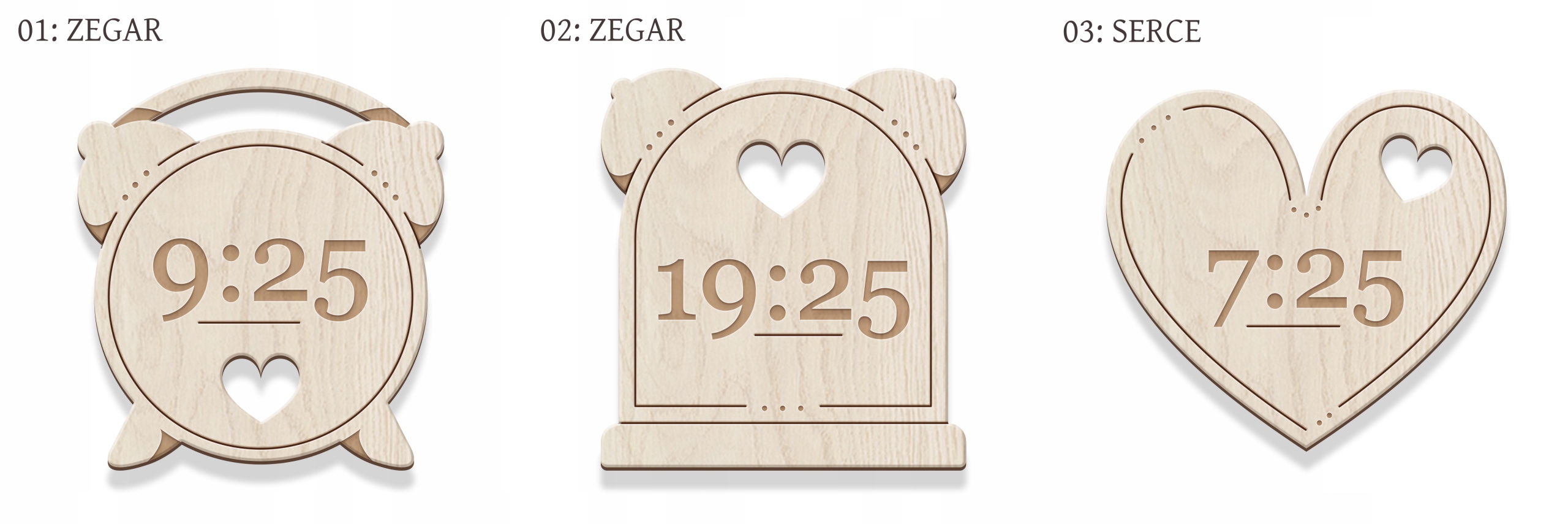 Na poszczególnych dekorkach możesz umieść inną informacje, np. na serduszku zamiast daty może być np. godzina. Po zakupie podanie numeru wybranej dekoracji plus dane jakie mamy na niej umieścić np. 03.serce - 22:30