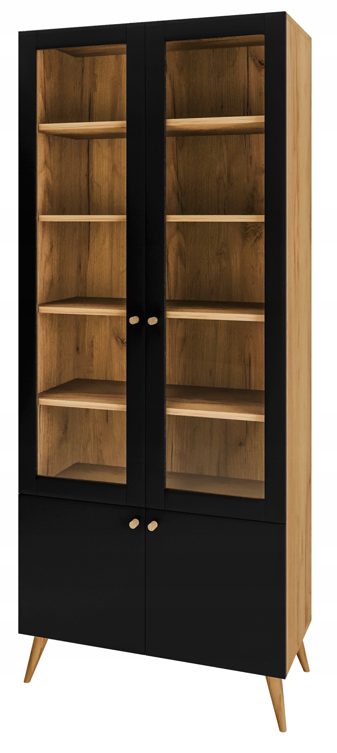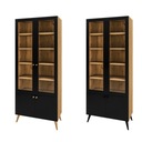 Głównym elementem są dwuskrzydłowe drzwi z delikatnymi ramkami, za którymi można eksponować dekoracje lub ulubione książki. Struktura witryny została starannie zaprojektowana, by jak najlepiej wykorzystać przestrzeń. Regulowane półki umożliwiają przechowywanie różnych przedmiotów, zapewniając porządek i organizację.