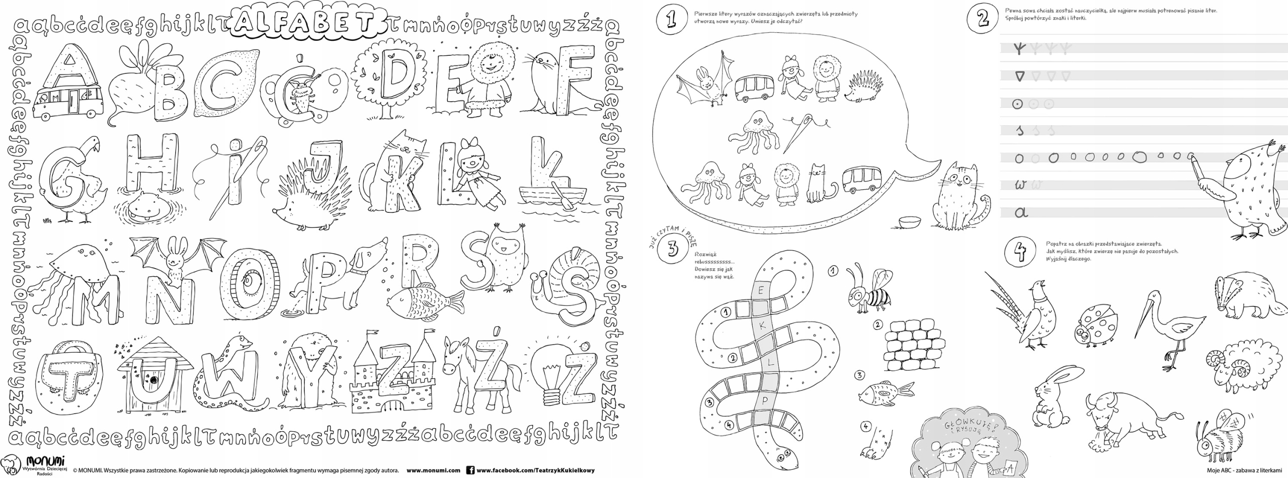 Alfabet i Kreatywność: Każda litera alfabetu jest przedstawiona w towarzystwie sympatycznych rysunków, które skojarzą się z odpowiednią literą, co ułatwia zapamiętywanie i uczy przez zabawę.