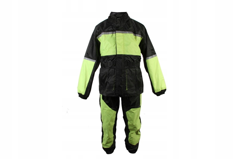 Przeciwdeszczowy dwuczęściowy kombinezon z kapturem zakładany na wierzchnie ubranie. Zamki błyskawiczne z przodu i na końcach nogawek ułatwiają zakładanie. Kolorystyka i elementy odblaskowe poprawiają widoczność motocyklisty szczególnie w czasie jazdy w trudnych warunkach atmosferycznych.